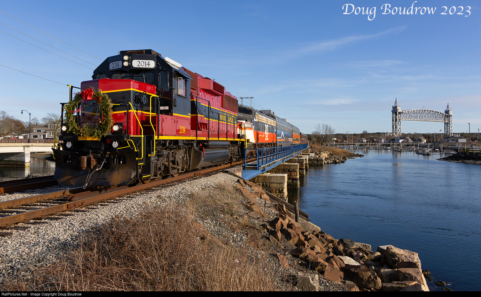 The 2 pm Cape Cod Central Polar Express is seen departing Buzzards Bay and crossing over Cohasset Narrows bound for the North Pole.
