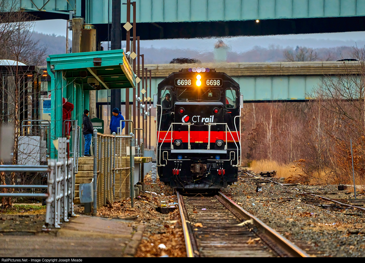 | Metro-North train 1928 led by CDOT/CT Rail 6698 GP40-3H is seen approaching Waterbury station as it clears CP528. The now defunct PanAm tracks can be seen adjacent to the main along with the I-84 span in the background |