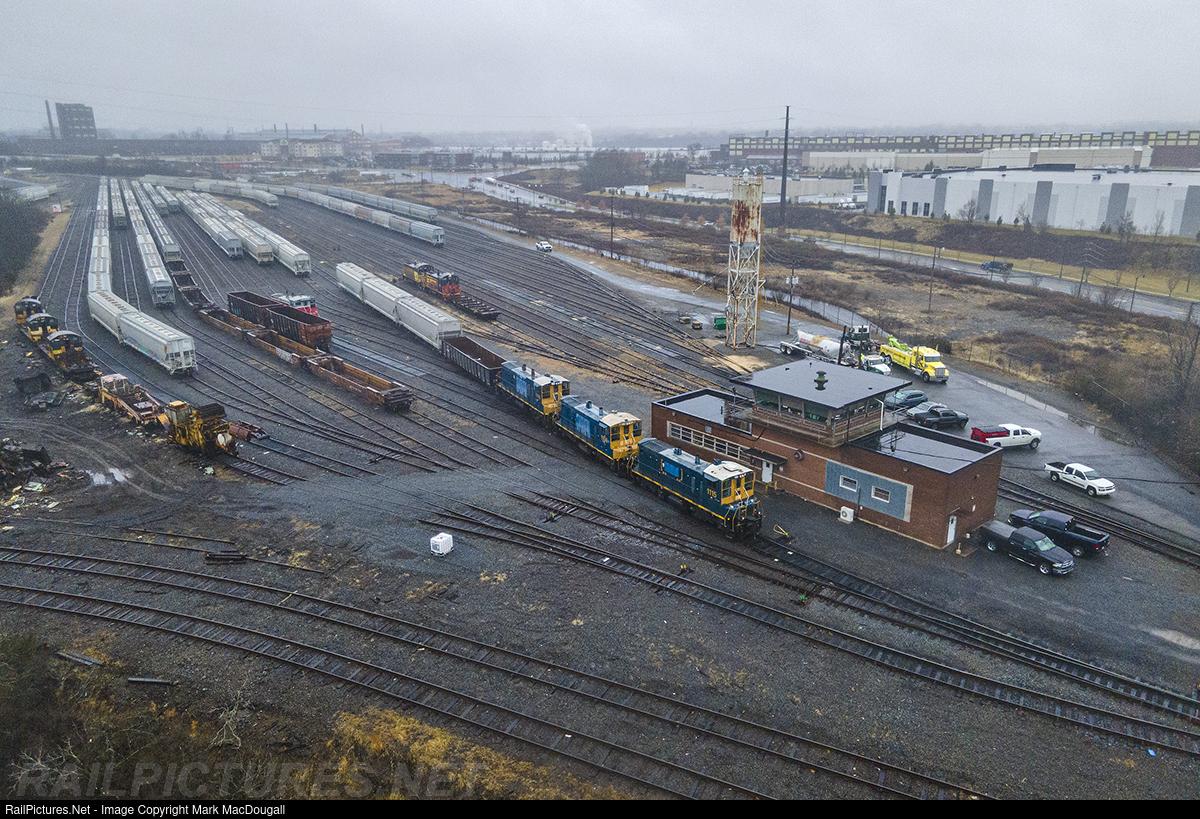 | Lehigh Valley Rail Management's AM job departs Iron Hill Yard on a rainy morning with a transfer run to NS behind a trio of ex-L&N/CSX switchers. This was once a booming location in the midst of Bethlehem Steel's plant, but today is largely used for storage. |
