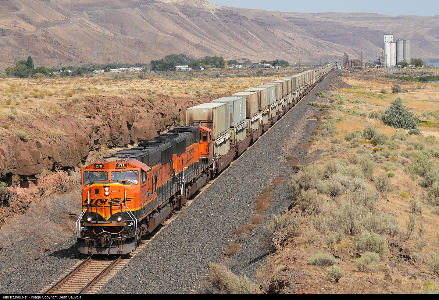 An empty BNSF "trash train" is in the process of easing onto the mainline of the Fallbridge Sub as it departs the yard at Roosevelt, WA. Republic Services operates a large landfill on top of the hill (access road visible at the upper left). Containers are offloaded here and trucked to the landfill. Trains shuttle the containers between here and the Seattle area.