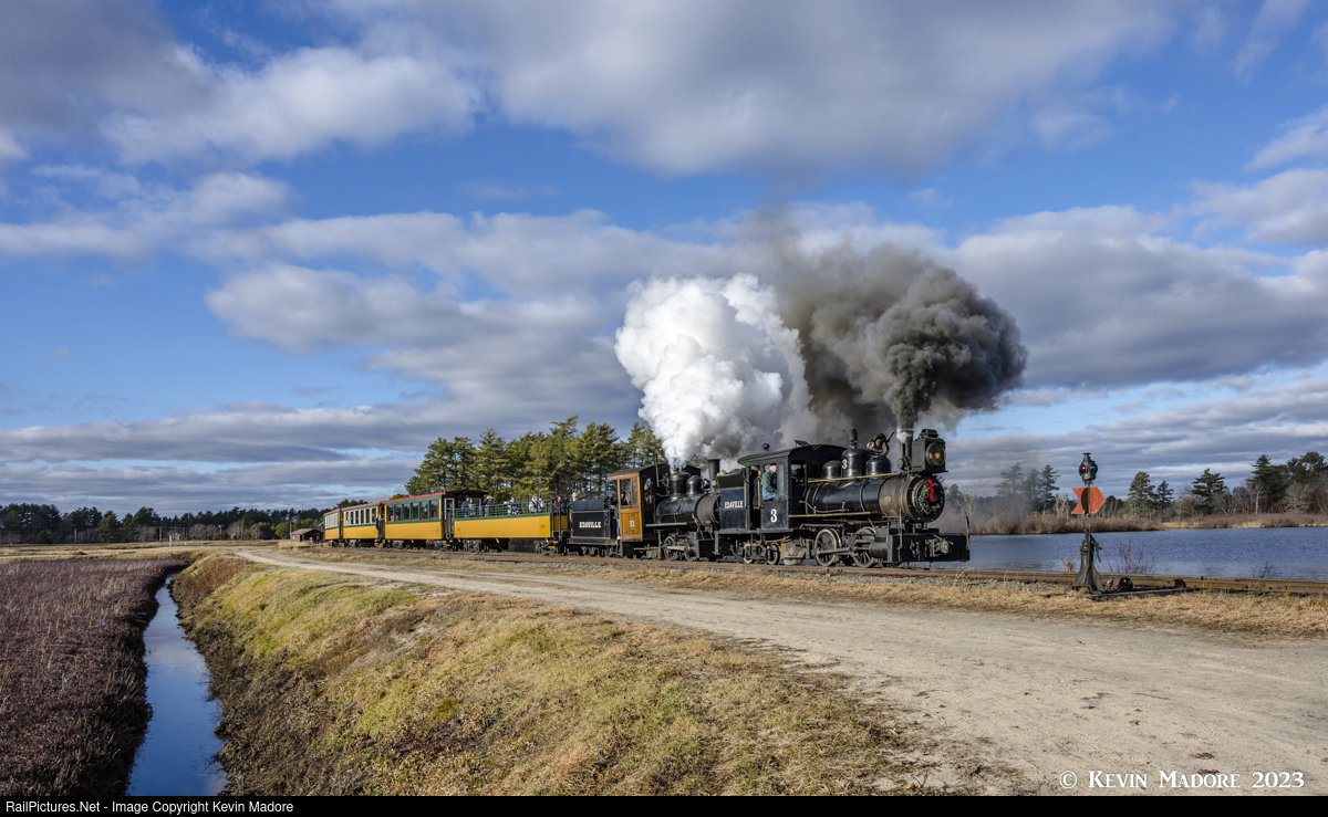 Massachusetts' only steam railroad. The words "Massachusetts" and "steam" are not often used in the same sentence. Other than the 2-foot gauge Edaville Railroad in South Carver, and a couple of short-lived amusement parks, such as "Pleasure Island", Massachusetts has never been a place where steam railroad preservation has flourished. In the early 1940s, when several of the 24" gauge railroads in Maine were going out of business, South Carver cranberry farmer Ellis Atwood started acquiring this unique, narrow gauge railroad equipment for use in servicing his expansive cranberry harvesting operations. Initially, he built a 5.5 mile railroad for his own use, but soon discovered that the public was enchanted with the little trains. For nearly half a century, his "Edaville Railroad" operated as many as 5 steam locomotives as a tourist operation, until that railroad went out of business in 1991. Although most of the original Maine, 2-foot equipment was acquired by a museum in Maine, and was repatriated to that state, interest in keeping the Massachusetts operation going has never died. Several operators have carried the torch over the ensuing years, using equipment acquired in other places and the place survives to this day, morphing as needed to meet the public demand. Today, the railroad at Edaville is in the hands of railroad people, and the focus is on bringing the operation back to its roots, including continuing the tradition of Edaville's famous Christmas Festival of Lights.