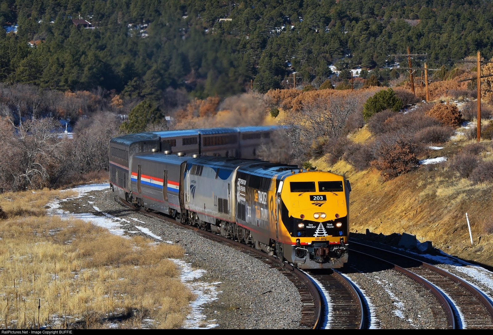 | The Southwest Chief, led by Amtrak's Operation Life Saver engine #203 (P42DC), runs the S curves south of Trinidad, Colorado.
