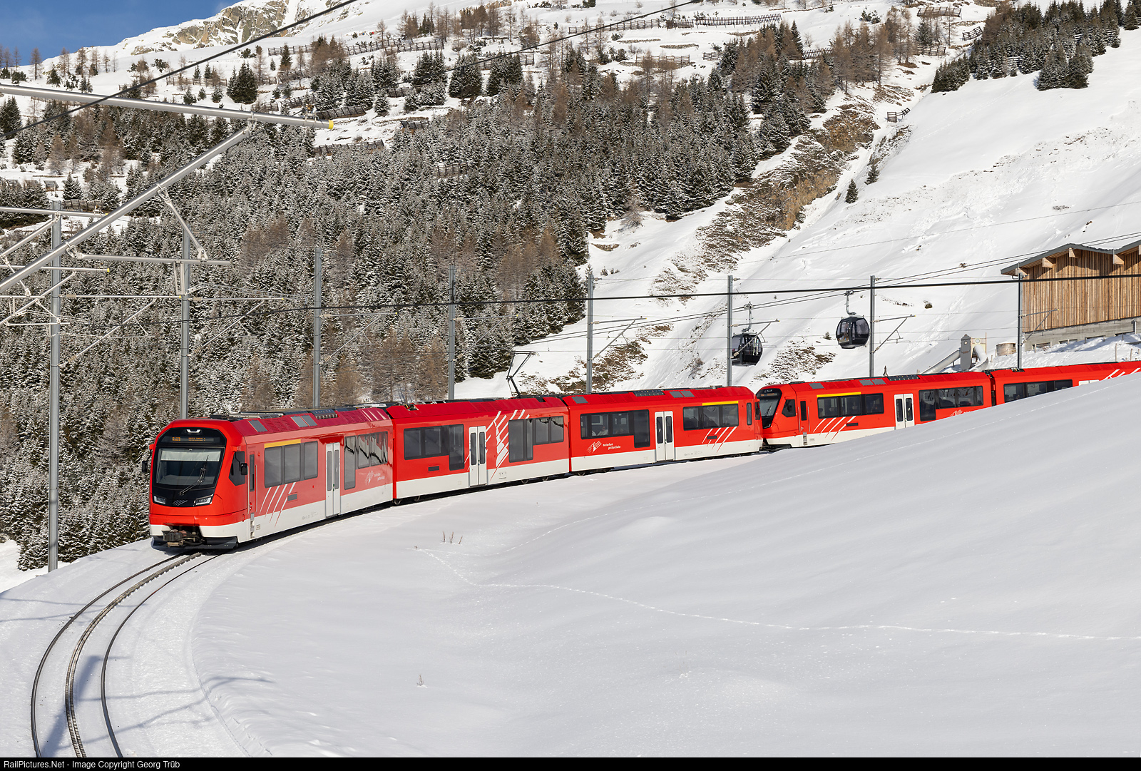 Since change of timetable on december 10, 2023, on the line of the Matterhorn-Gotthard-Bahn from Andermatt over the Oberalp pass to Disentis, the new "Orion" trains, built by StadlerRail, have taken over all regional services. ABeh 8/12 # 311 and # 305 in multiple control are running the R45 service 827 from Disentis to Andermatt, below Nätschen.