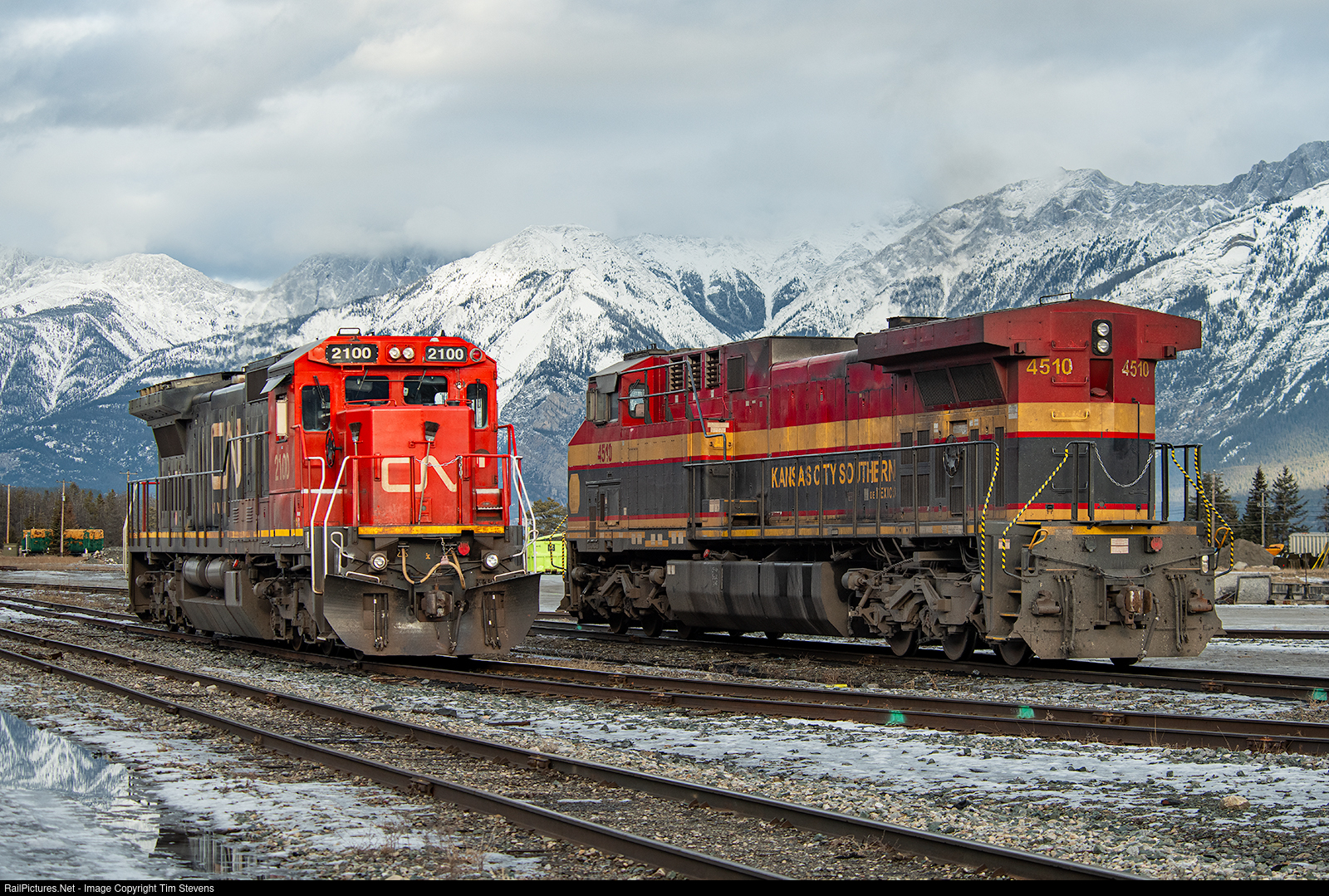 CN C40-8 2100 and KCSM AC4400CW 4510 idle on the shop tracks in Jasper.