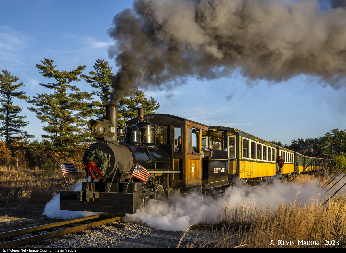 Edaville Railroad #11. Here's a close-up of Edaville #11 as she approaches the station area in South Carver, MA. This engine began life as a 30" gauge, Porter saddle-tanker which worked in an industrial environment at Raritan Copper Works (later Anaconda Copper) in Perth Amboy, NJ. She literally worked at that company until it went out of business in 1976. Long a static display at the old Edaville Railroad, she was pulled out of retirement and restored to operation by the folks at Maine Locomotive & Machine in 2013. Although she's been heavily modified from her original configuration, the result is very pretty indeed. She's got a new, wooden cab, and a fully-functional tender, giving her better range and much better ergonomics than the original locomotive. She's ideal for this operation.