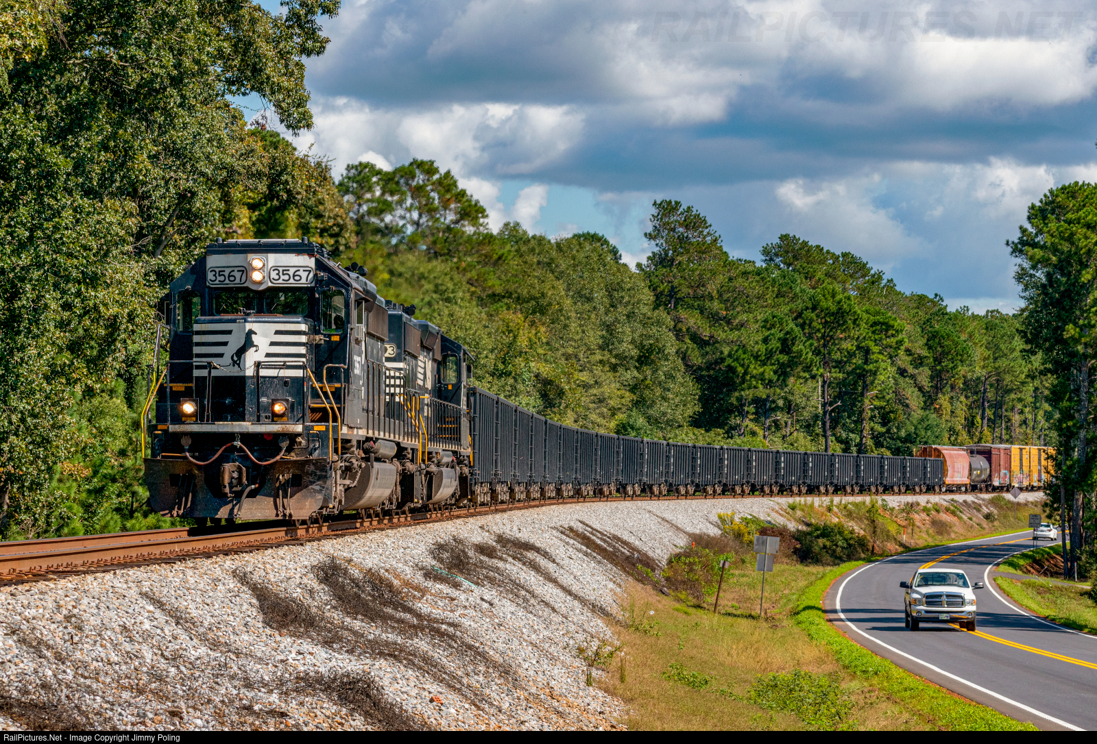 On a warm Saturday afternoon, we find ourselves trackside for a rare Saturday run of G02 headed north to Griffin, GA from Macon, GA. As of October 2021, G02 operated Monday-Friday and departed Macon north/westbound in the morning bringing cars from Brosnan to the yard in Griffin, working locations such as Barnesville, GA along the way. In this capture, the pair of EMD SD40-2s have a good-sized consist headed north along US-41 in Collier, GA. The leader, NS 3567 has since been rebuilt to SD40-3 6419 and G02 is now a daily job from the looks of it.