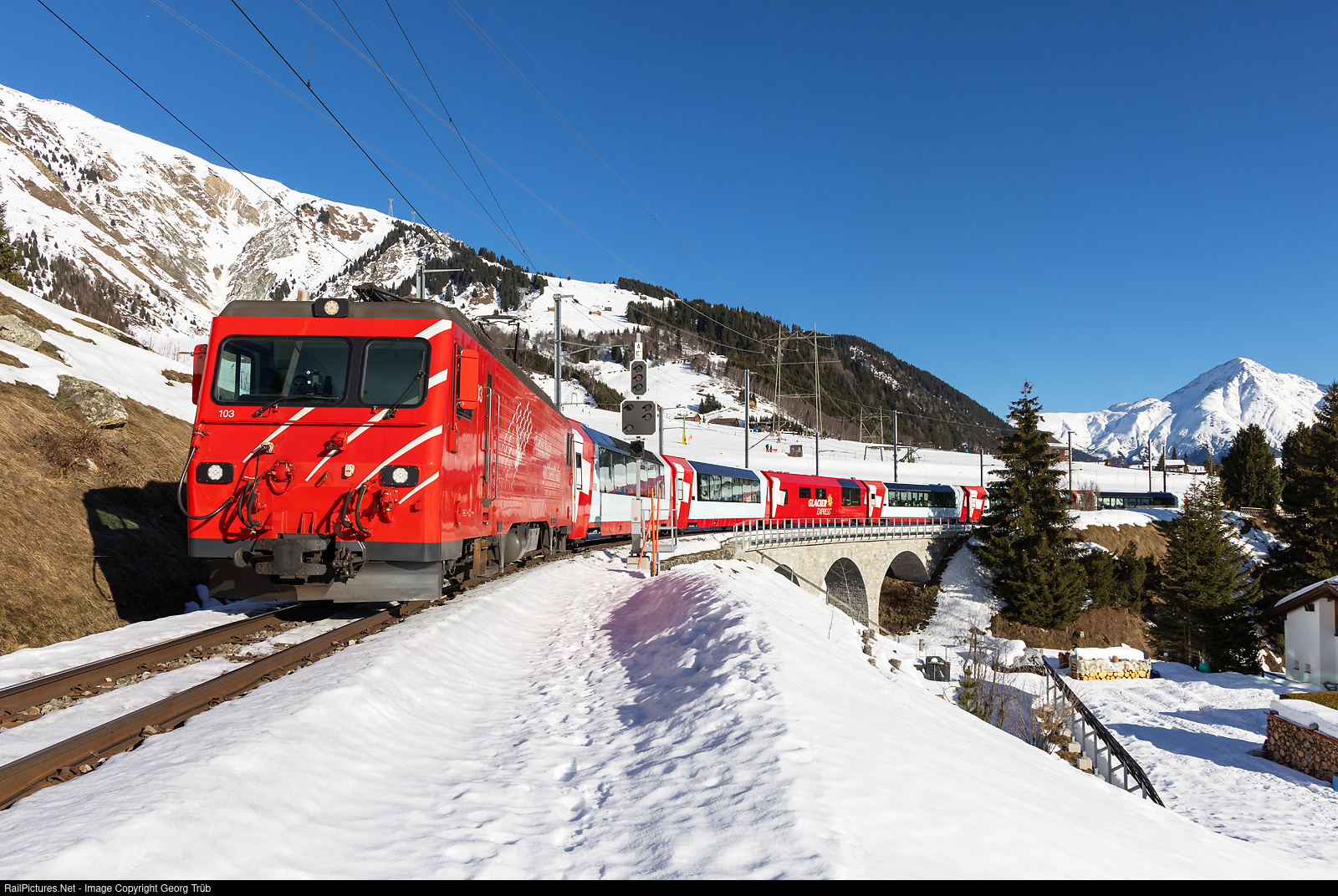 | Cogwheel locomotive HGe 4/4 II # 103 of the Matterhorn-Gotthard-Bahn pulls the PE 925 GLACIER EXPRESS St.Moritz-Zermatt over the Strem bridge, between Sedrun and Rueras. |