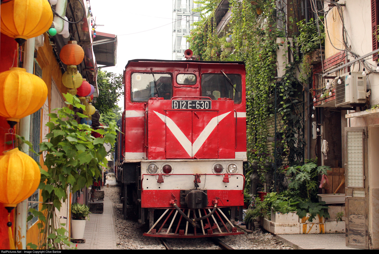 Duong Sat Viet Nam (DSVN - Vietnam Railways) CKD built D12E 630 passes along one of the railway streets in Ha Noi whilst on the rear of LP2 0610 Hai Phong - Ha Noi on 6th November 2023. The narrowness of the railway street can clearly be seen. Trains from Hai Phong often attach a loco on the rear at Gia Lam as there is insufficient time to turn the inbound loco, if it is a single cab loco. These 1200hp locos were seen hauling 17 coaches on Hai Phong services, quite a load for a small loco.