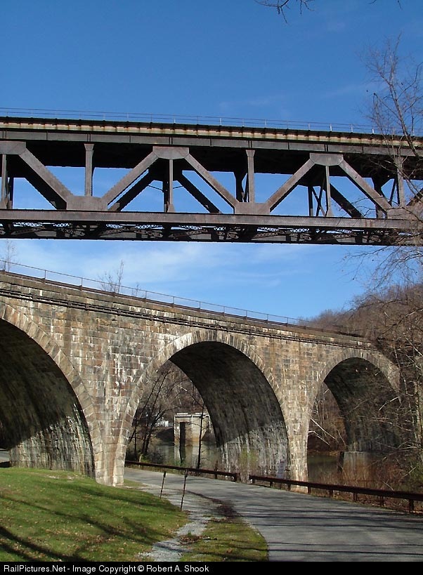 The present day NS mainline bridge deck towers above the original PRR Conemaugh Line arched Viaduct.