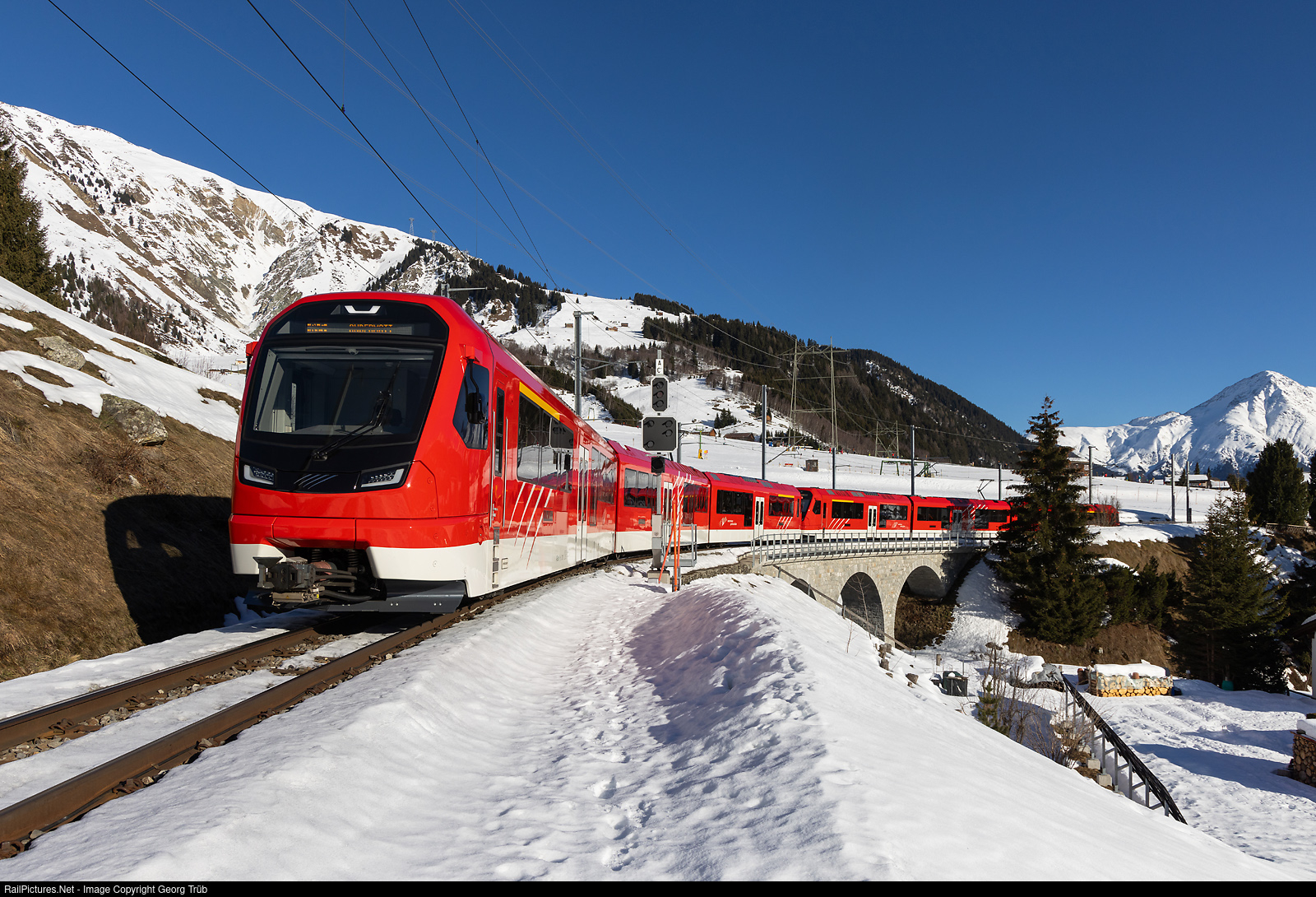 With the change of timetable on december 10, 2023, on the Oberalp pass line of the Matterhorn-Gotthard-Bahn (MGB) from Andermatt to Disentis, the new "Orion" trains from StadlerRail have taken over all regional services. ABeh 8/12 # 310 and # 309 in multiple control are running the R45 service 839 from Disentis to Andermatt, crossing the Strem viaduct between Sedrun and Rueras.