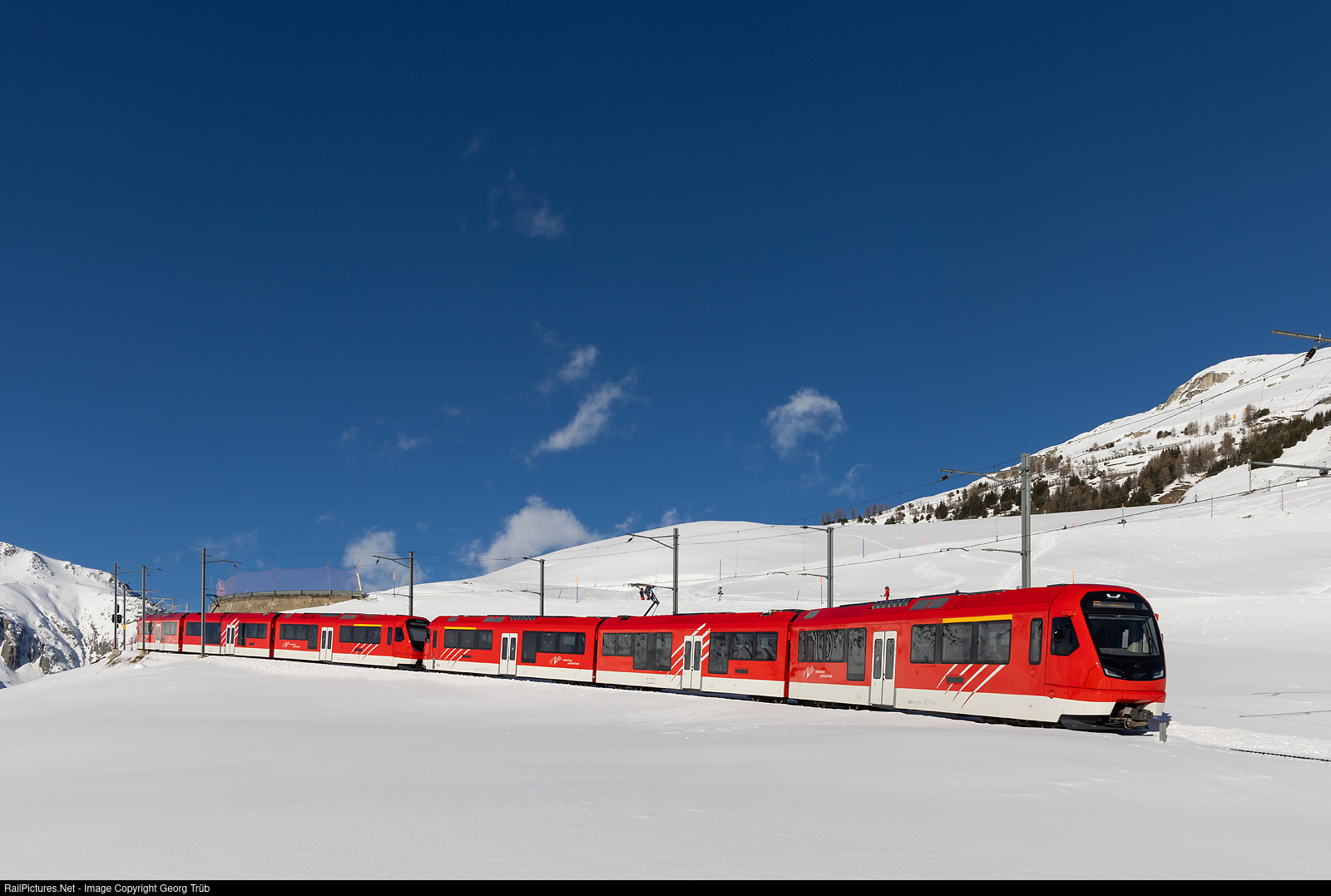 | With the change of timetable on december 10, 2023, on the Oberalp pass line of the Matterhorn-Gotthard-Bahn (MGB) from Andermatt to Disentis, the new "Orion" trains from StadlerRail have taken over all regional services. ABeh 8/12 # 311 and # 301 in multiple control are running the R45 service 827 from Disentis to Andermatt below Nätschen. |