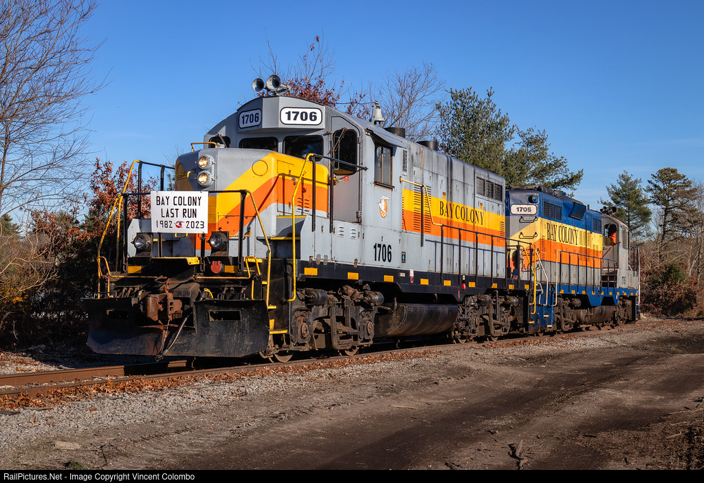 | On December 15, 2023, the Bay Colony Railroad ended operations after 41 and ½ years of service. On their last day, the crew ran both the 1706 and 1705 on the Watuppa Branch to interchange cars with Mass Coastal in New Bedford. I was lucky enough to make a sign that was posted on the engines to commemorate the last run. Here the train is posing for a photo at a private crossing west of Old Reed Road after dropping cars at Mid City Scrap. |