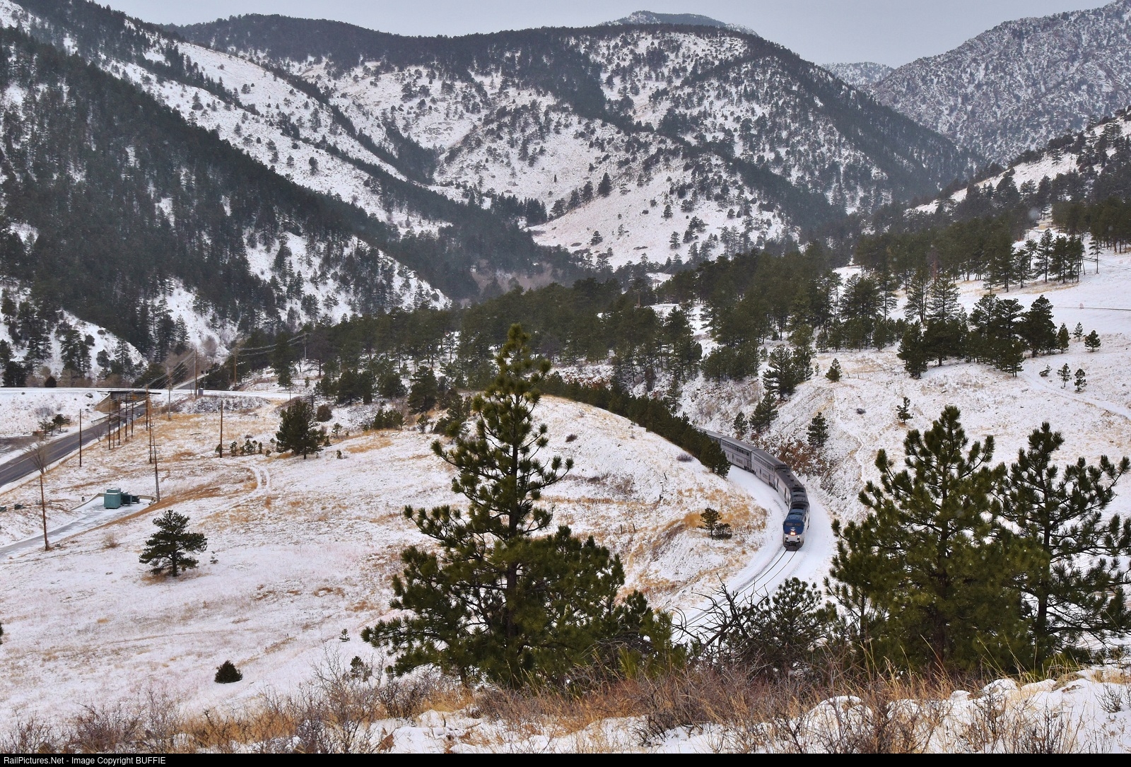 Snow is falling over Coal Creek Canyon, Colorado as the California Zephyr runs through the cut leading up to Tunnel #1.