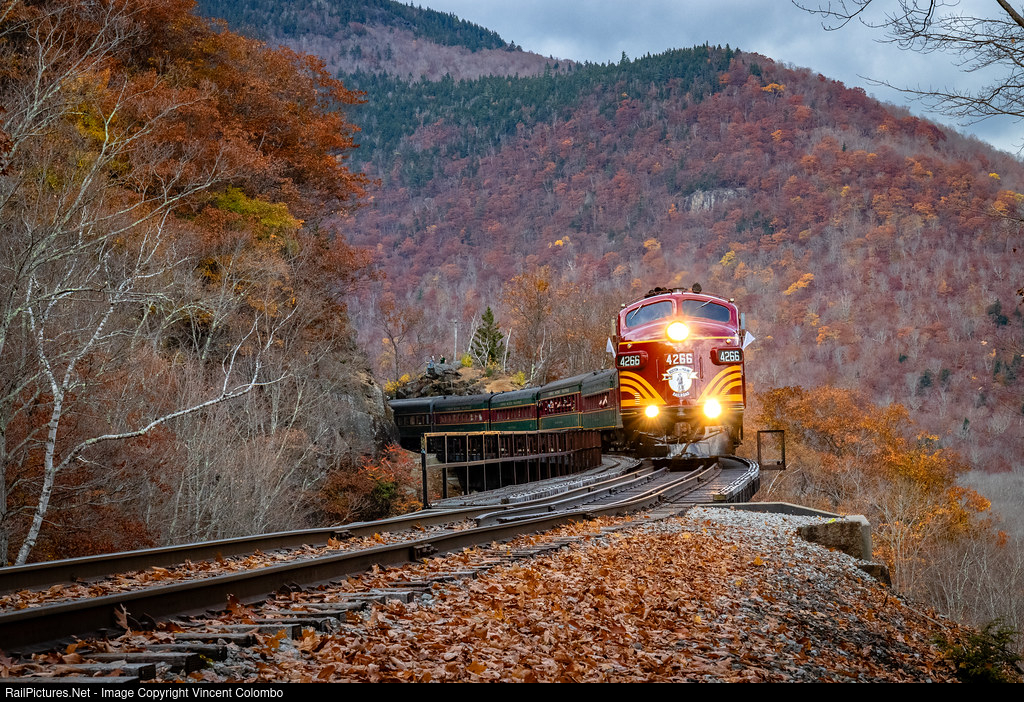 | 4266 and 4268 are seen descending the grade here at the Frankenstein Trestle. The two veteran B&M F7s, now owned by the 470 Railroad club, are in the lead of the club's annual excursion on the Conway Scenic Railroad. |