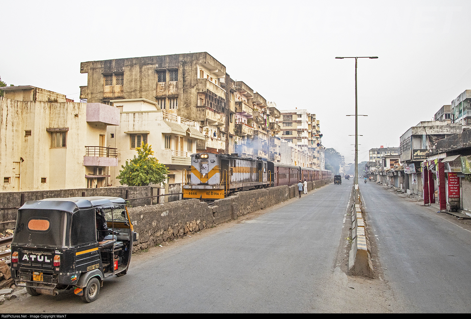 | You can't call it proper street running as there's a wall between them, but there's about half a mile of this parallel running in the city of Junagdah and here another ALCO YDM4 powers out of the town with the morning train to Delvada as the city starts to wake up. |