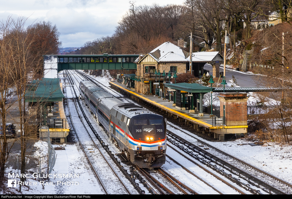 Snow Enough For The Photos. By the time Amtrak Train 284 passed through the station at Philipse Manor in Sl eepy Hollow, New York on January 7, 2024, the snow had stopped falling for the day. The Tudorbethan architecture style granite block original station building opened in 1911, and is one of only two Hudson Line stations on the National Register of Historic Places (Poughkeepsie is the other), though the station no longer serves commuters and is now the home of the Hudson Valley Writers Center. The scene is nicely complemented by the region's first snow in almost 2 years. GE built P32AC-DM 703 wears the Phase III paint scheme that is the standard for the dual mode locomotives in Empire Service.