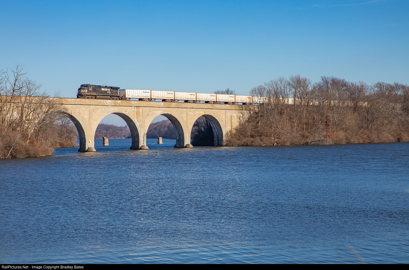 Norfolk Southern TripleCrown Roadrailer Train 255 crosses over Lake Decatur into Decatur, IL.
