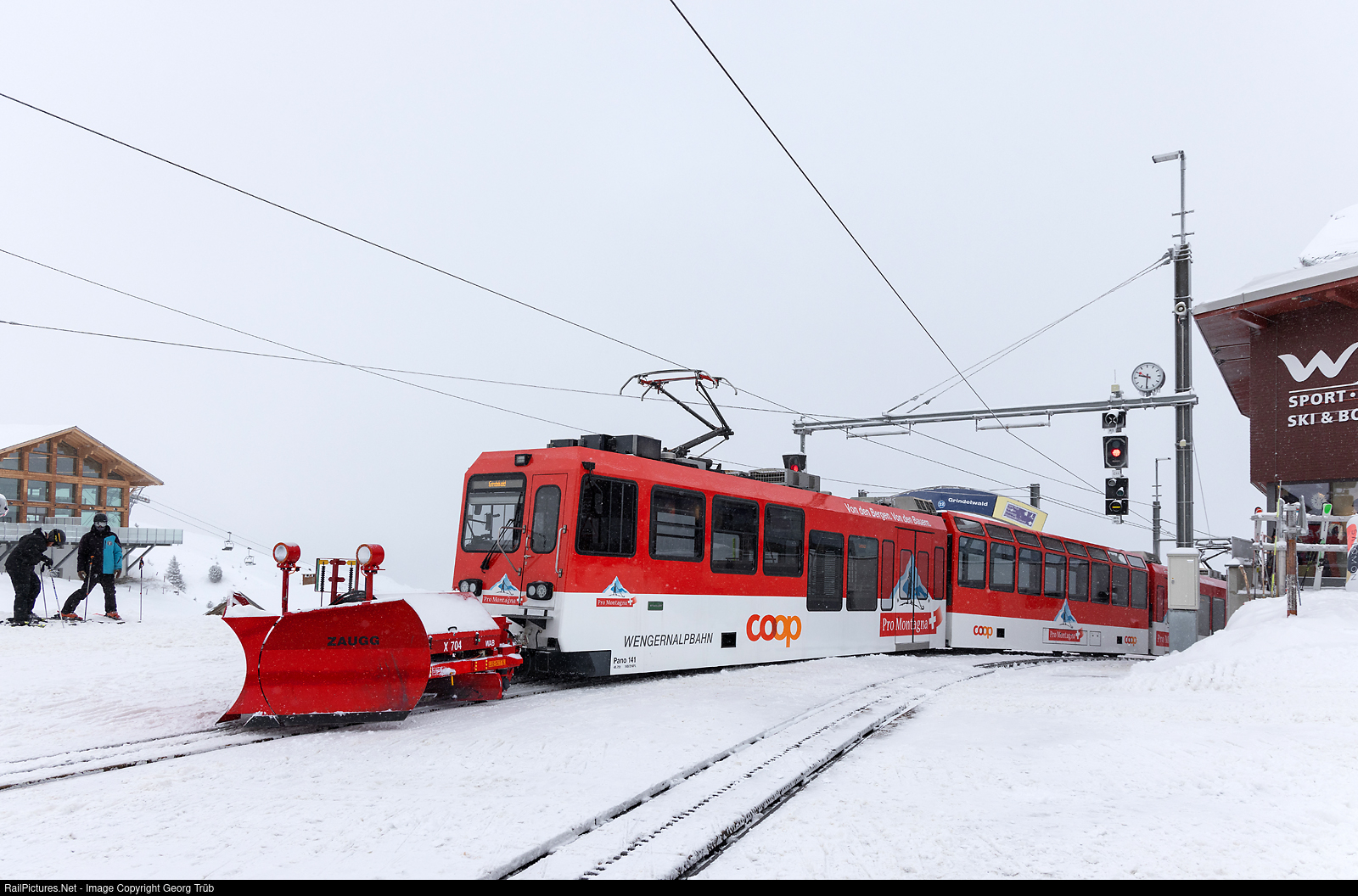 Train 438 of the line CC64 of the 80 centimeter gauge Wengernalpbahn is leaving Kleine Scheidegg to Grindelwald, with lowfloor panorama trains Bhe 4/8 # 141 (in the Coop Pro Montagna paint scheme) and not visible # 142 in multiple control. In the rear is the track plow X # 704, built by Zaugg in 1995. On such days, on the Grindelwald as well as on the Lauterbrunnen side, one of the circulating trains have such a track plow in use.