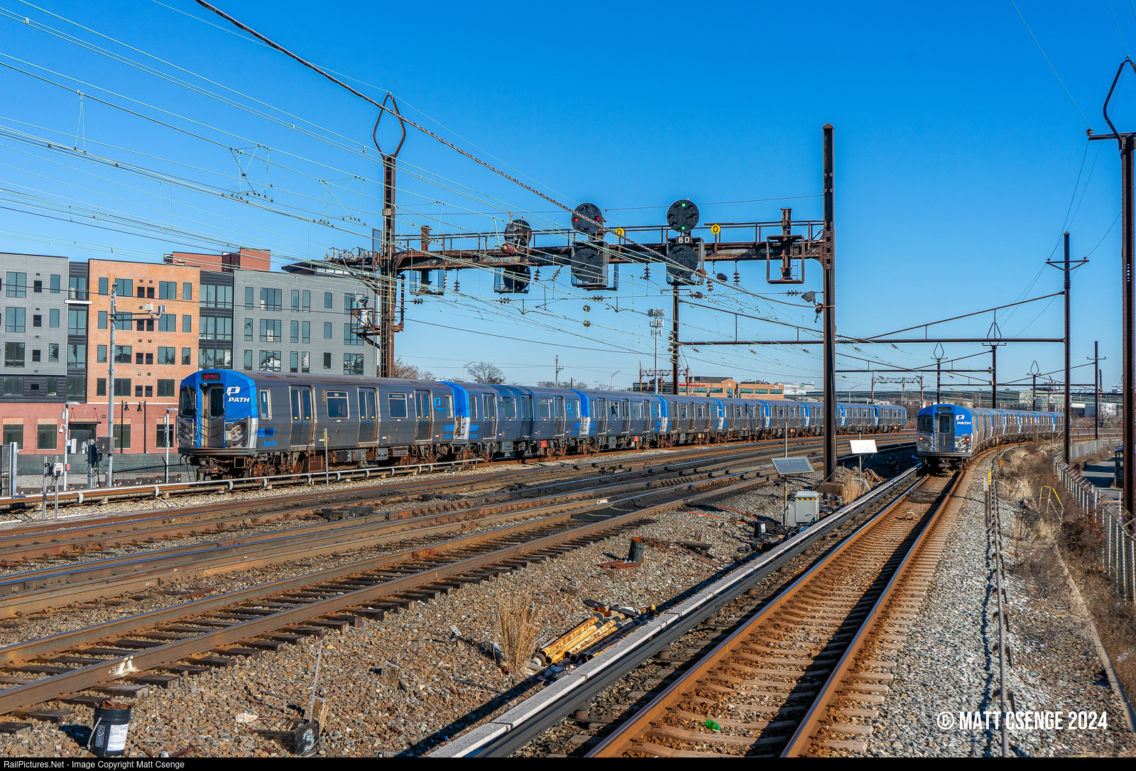 Long and Winding PATH. Port Authority Trans-Hudson (PATH) PA-5 car no. 5808 is the lead unit on a 9-car Newark-bound train seen just east of Harrison Station, while another train races away towards Jersey City and New York. As part of a larger project to improve service, stations along the Newark-WTC route were recently extended, which coupled with the delivery of new PA-5 cars from Kawasaki enabled 9-car trains to begin operating on the route in early 2023. Initially only a few trains during rush hours operated with 9 cars, with all others operating with the previous standard of 8 cars, but the number of 9-car trains has steadily increased since then.