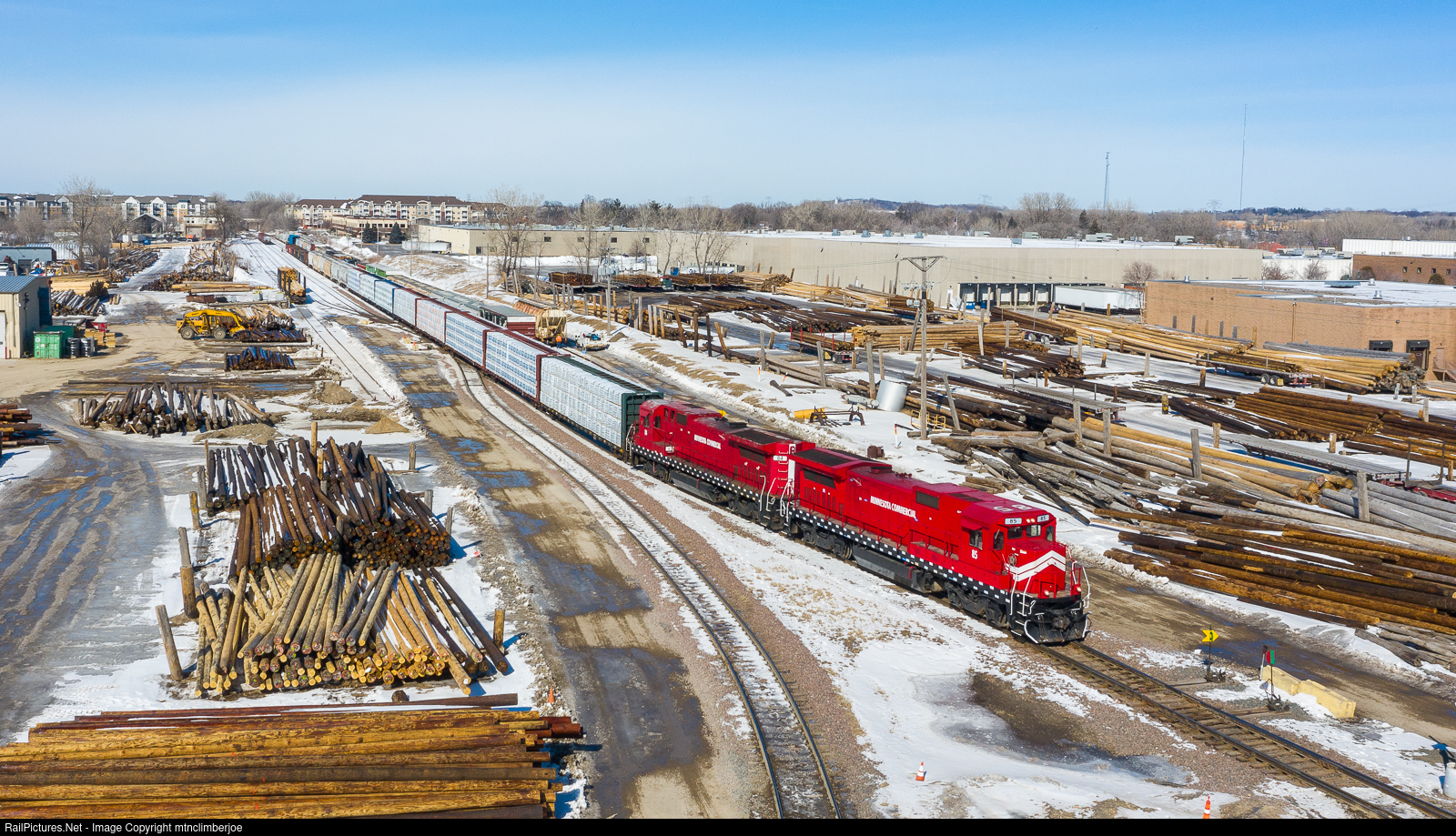 | A pair of Minnesota Commercial B39-8E's on the Job 46 "Belt Job" work the yard in New Brighton, Minnesota, pulling out a cut of loaded centerbeams as they build their southbound train to head back to Midway. The yard here allows MNNR interchange with CN, who accesses it via CP's Withrow Subdivision that crosses the MNNR just south of the yard lead. |