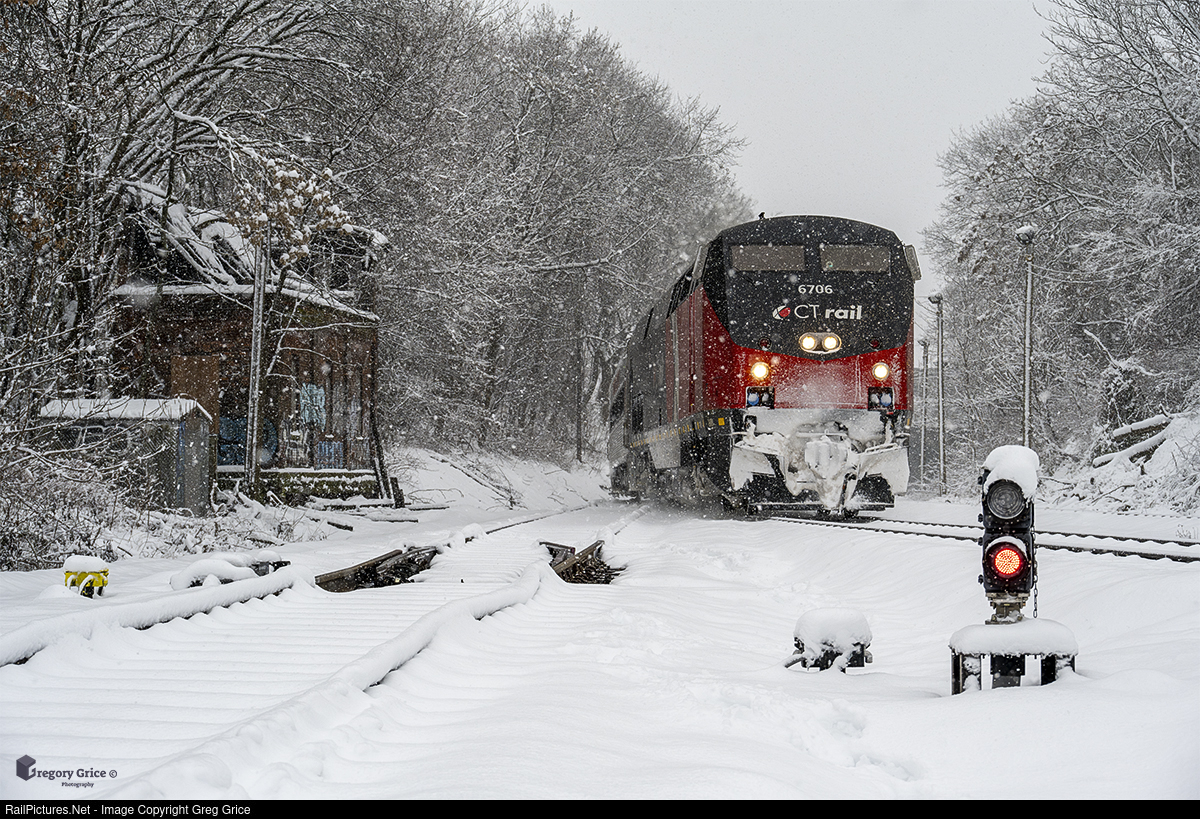 As snow falls on the afternoon of January 7th, 2024, north-facing CTrail (CTDX) GE P40BH 6706, leads northbound CTrail Hartford Line train 6454 past the abandoned Hart Tower (NYNH&H RR SS-214) in Hartford, Connecticut on the MRS (Hartford) Line.
