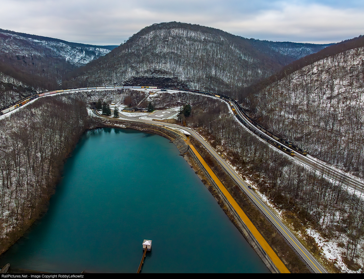 Manifest train NS 18N and loaded coal train NS 590 race side by side one another, as they round the bend at Horseshoe Curve, as both trains prepare to enter into Altoona at daybreak. |