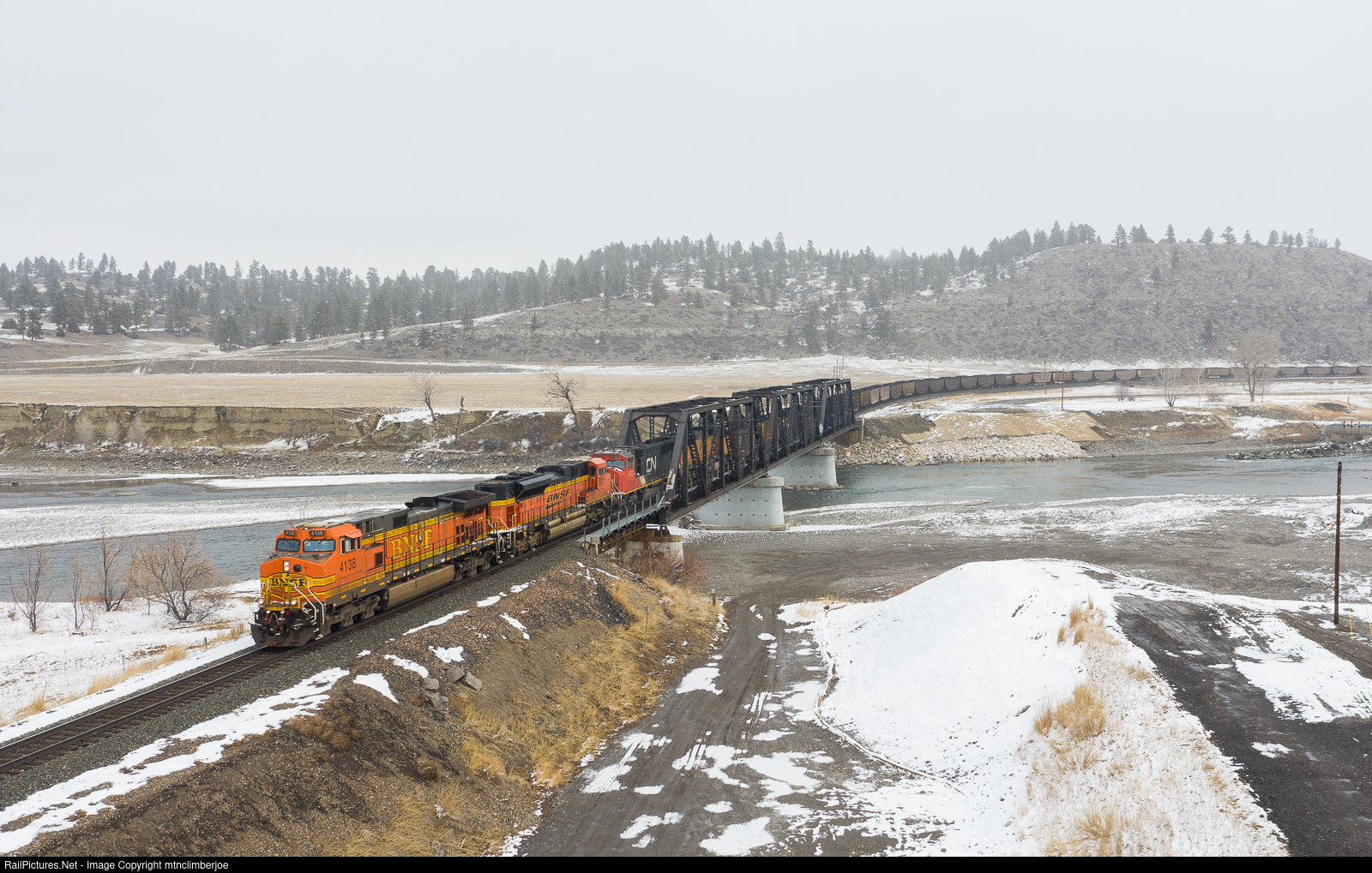 With a BNSF Dash 9 leading three EMD's, a loaded westbound coal train cruises across the Montana Rail Link's 2nd Subdivision on a snowy spring day. The train is crossing over the Yellowstone River at Reed Point, Montana at a location known at Twin Bridges. The road span was demolished in 2021 due to erosion damage. In the summer of 2023, this railroad bridge suffered a collapse as well, but was quickly rebuilt by MRL crews to restore the mainline in only 28 days.