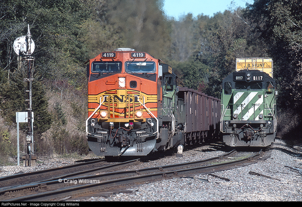 Back in 2006, the BNSF was detouring these Granite City ore trains via Aurora. I don't remember exactly why, but I think it was a bridge issue or something? Either way, it was cool to see these heavy train pounds out of Savanna and across the C&I. Here, one is down and out as they pass a parked train in the siding at Burke. Scanned Slide.