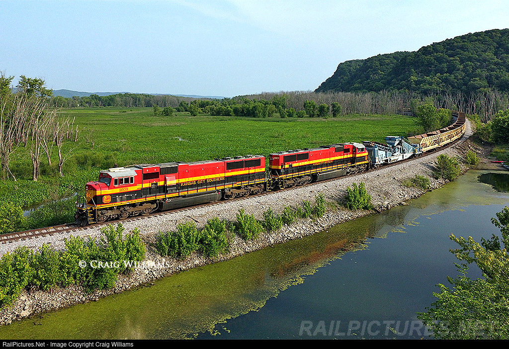 With the massive flooding the CP took in May from the Mississippi River, there has been so much work done along the Marquette Sub. Many, many work trains have been up and down this Marquette Sub. Some of the cooler power has been sets of these KCS SD70MACs. An empty belt train is working north towards Portage and a reload. Here, the train swings around the curve at Waukon Jct, 7 miles north of Marquette. They will duck in the siding at Harpers Ferry to meet 260 here in 5 miles.