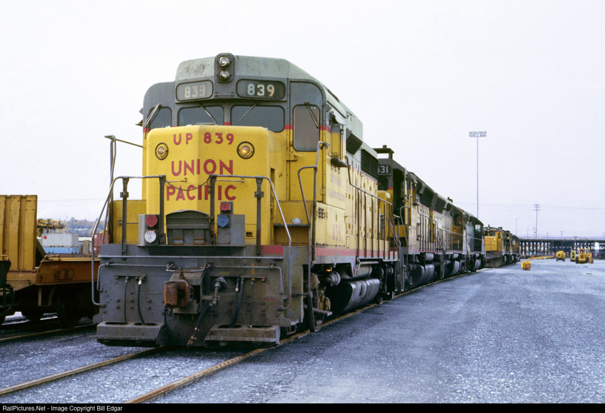 | UP GP30 no. 839 leads a trio of SD45s at Argo Yard, Seattle, WA as it waits for an assignment to an outbound freight to Portland and points east. In 1974 it was typical for UP to have 3 freights arrive and depart in addition to local activities. |