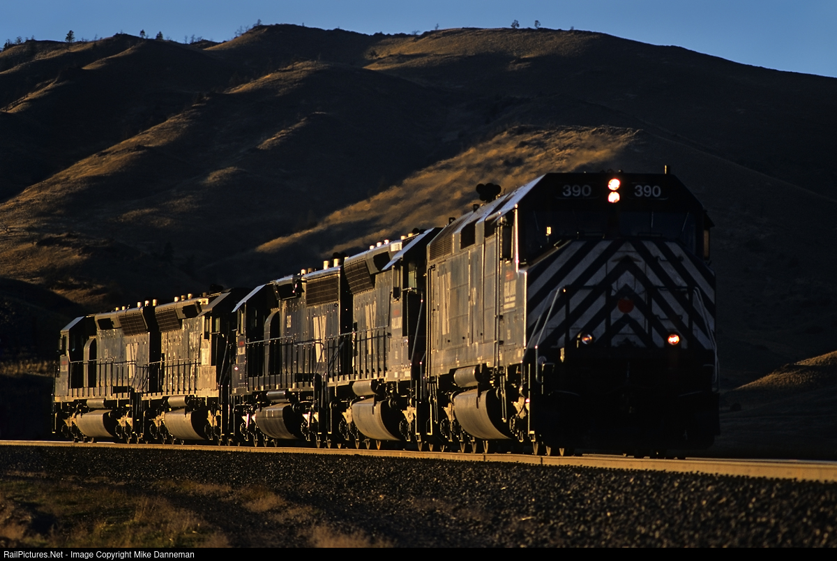 Five Montana Rail Link EMD six-axle locomotives, used as a helper set on Bozeman Pass, head downgrade back to Livingston glinting the setting sun on October 10, 2005. Westbound trains get plenty of help by this set, with MRL No. 390 leading a SD45-2 and a trio of SD45s for a total of 100 cylinders producing 10,800 horsepower.