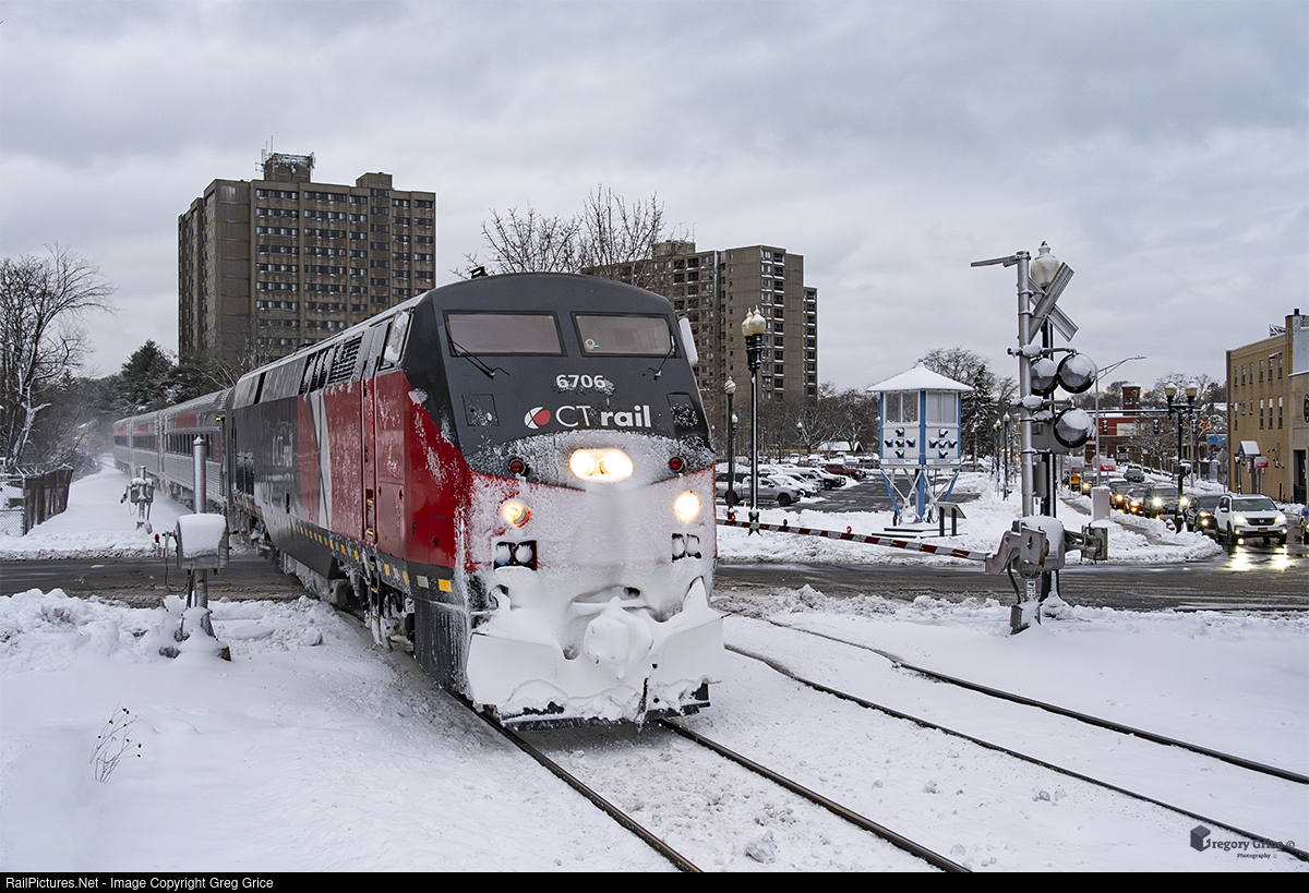 On the wintery afternoon of January 7th, 2024, north-facing CTrail (CTDX) GE P40BH 6706, leads northbound CTrail Hartford Line train 6458 past the the historic 1920's Traffic Control Tower at Colony Street in Meriden, Connecticut on the MRS (Hartford) Line.