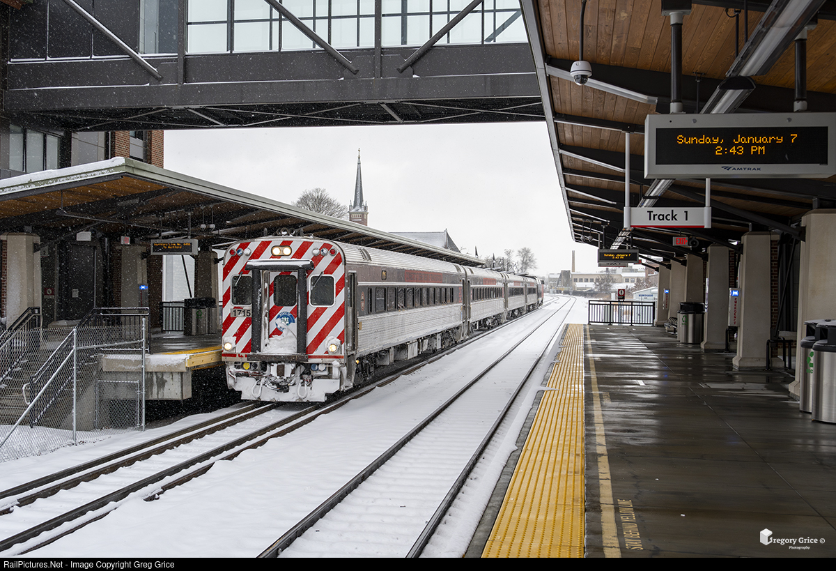 On the snowy afternoon of January 7th, 2024, CTrail train 6456, led by Connecticut Department of Transportation (CTDOT) Mafersa cab car 1715, makes a station stop at Wallingford, Connecticut on the MRS (Hartford) Line. All of the Hartford Line's rebuilt stations feature heated platforms, which play a vital role during inclement weather.