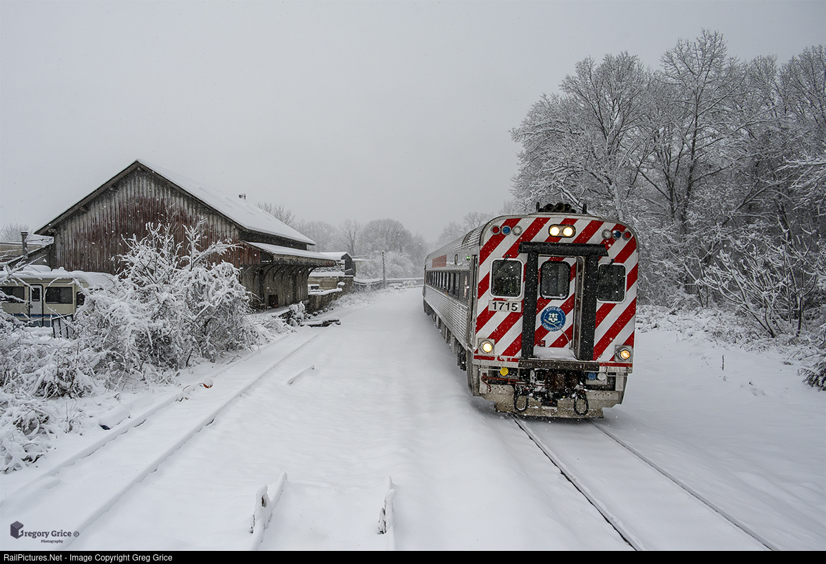 Snow blankets the area on the morning of January 7th, 2024, as Connecticut Department of Transportation (CTDOT) Mafersa cab car 1715, leads northbound CTrail Hartford Line train 6402 past the old NYNHH RR Warehouse Point Freight Depot in Enfield, Connecticut on the MRS (Hartford) Line.
