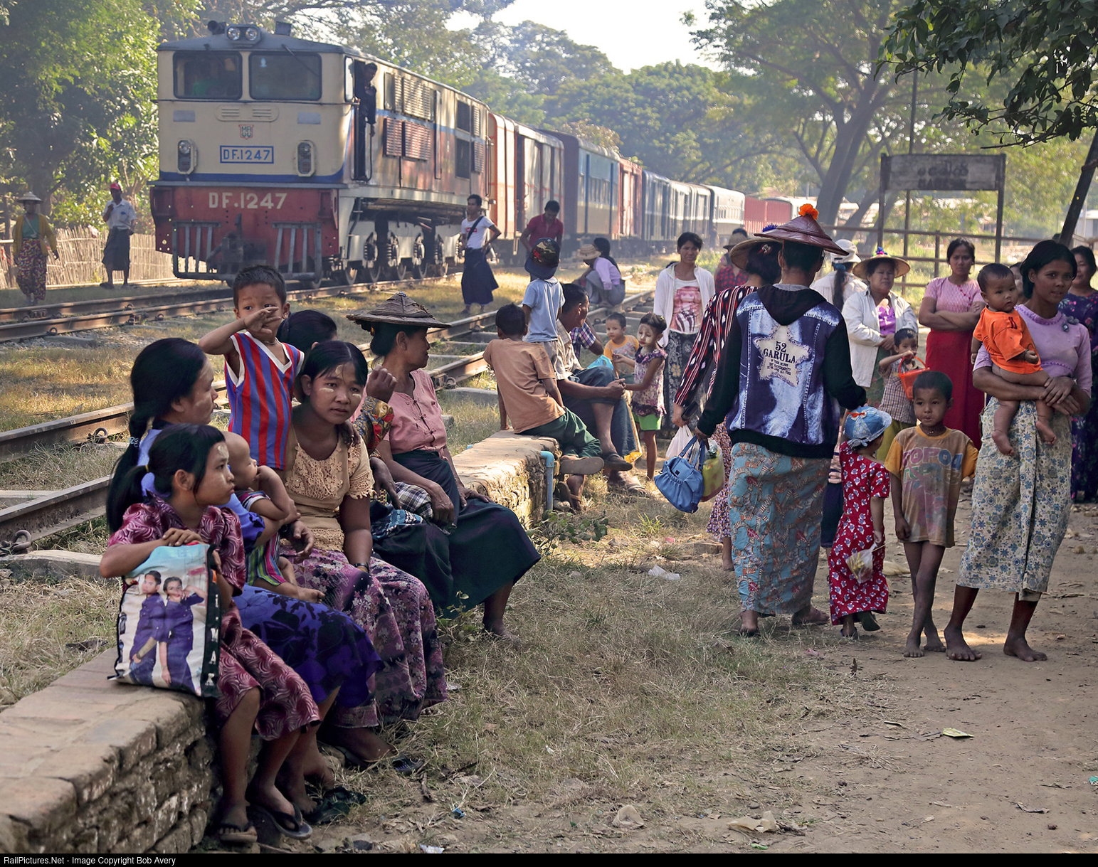 | Crowds near the station, on its penultimate day as part of Myanmar's rail network. I suspect the crowds were unaware of this fact. 9th December 2019. The loco is Alstom Bo-Bo-Bo 1247 which had hauled our special up the branch. YC Pacific 629 is out of sight at the other end (Far Rail charter). |