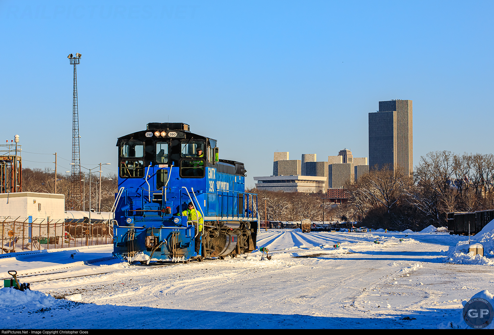 | After sorting and dropping off the high & wide load for the Port of Albany, GMTX 390 leased by the Albany Port Railroad returns to the shop as the early morning sun casts over the Corning Tower and the rest of Albany's Empire State Plaza giving a nice glow to the fresh snow. |