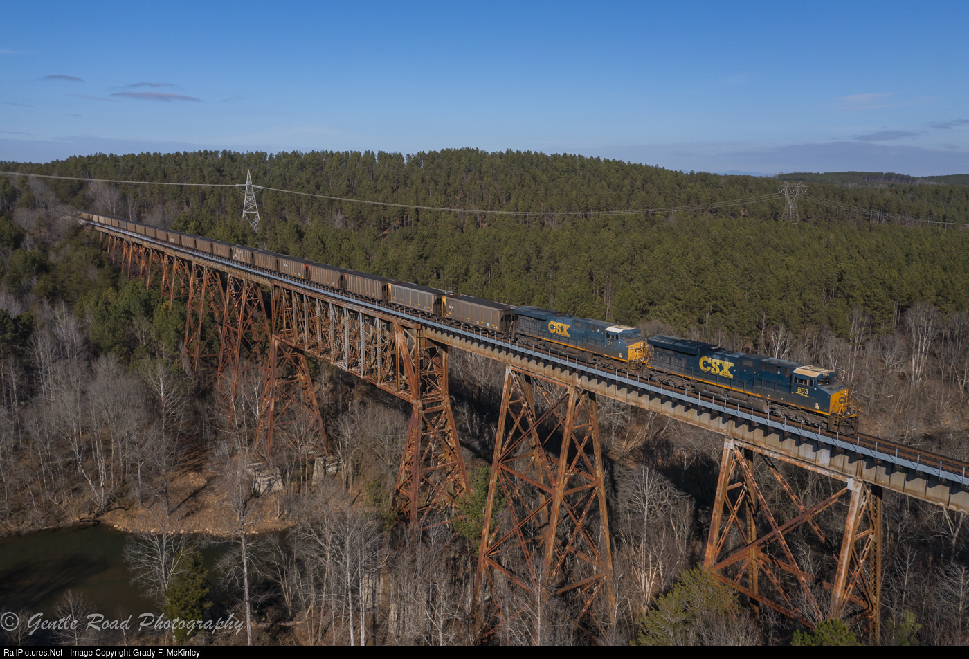 Brice coal loads soar across the Broad River trestle near Cliffside, NC on the former Clinchfield mainline.
