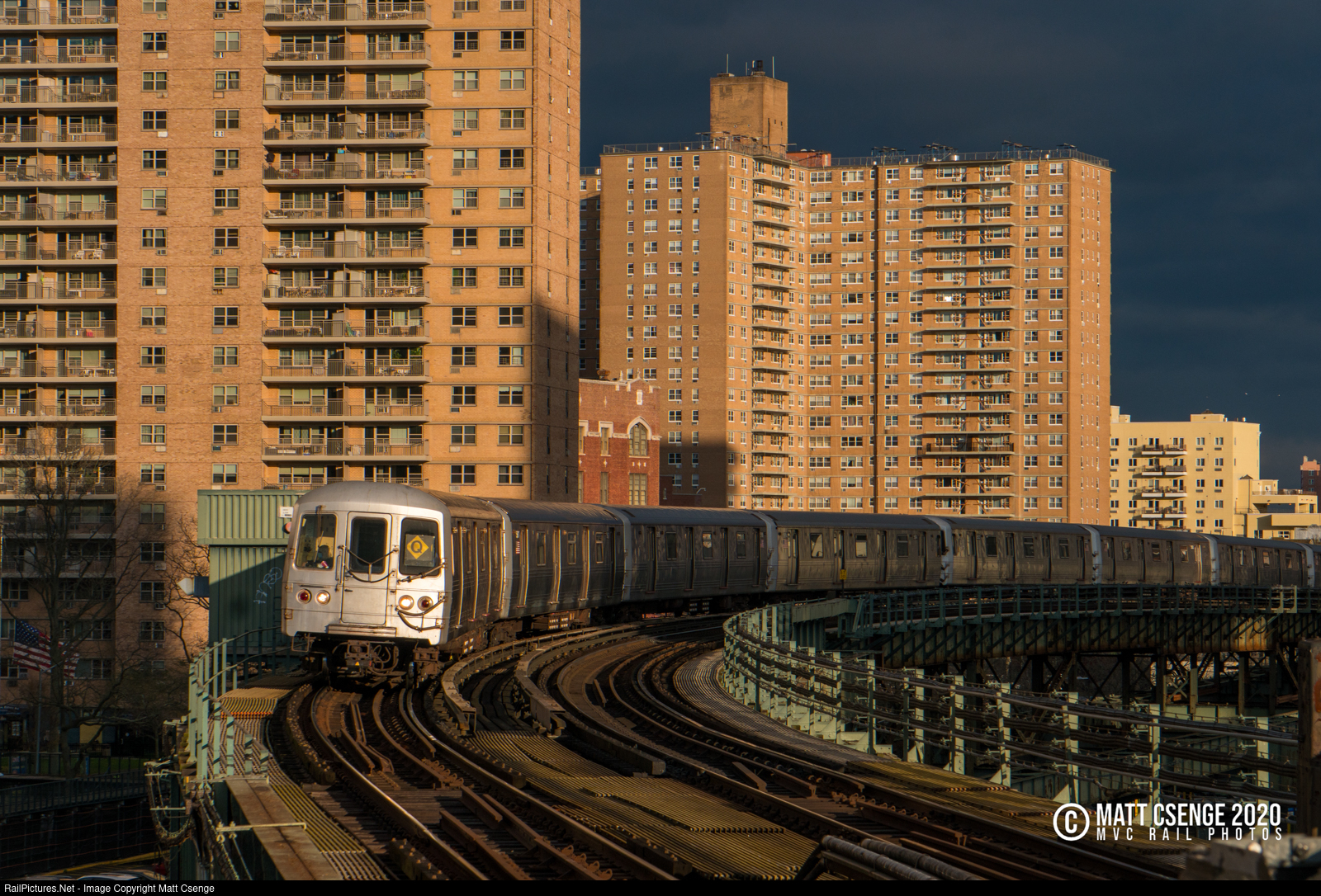 A southbound New York City Transit Authority (NYCTA) Q train, with the lead R46 car bearing the old diamond bullet, approaches W 8th St Station on the BMT Brighton Line in some beautiful golden hour sun and ominously dark clouds. |