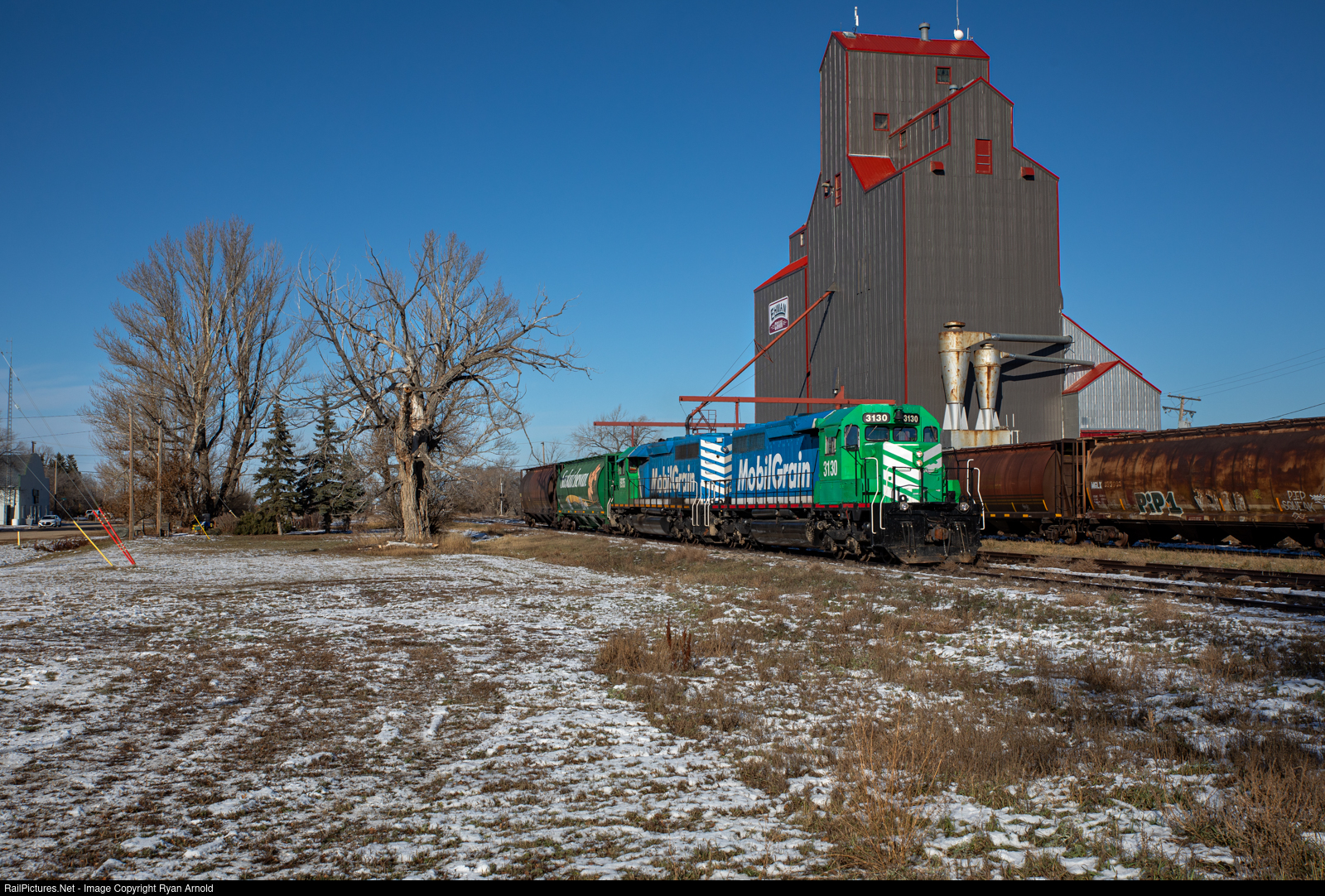| A short mobile grain transfer heads south through the town of Craik, SK. I believe they were heading to transload the grain from their cylinders to CN Hoppers for interchange. Craik is a quiet town with some nice people, they let me pet their dogs. |