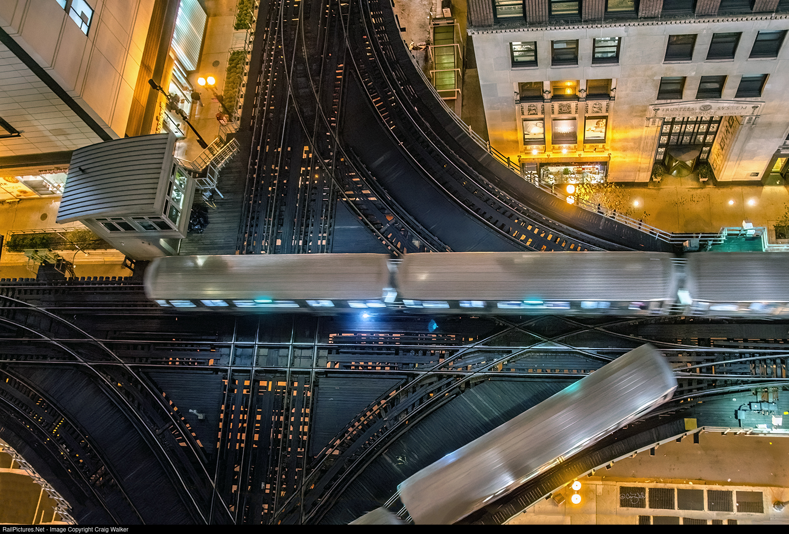 Chicago Transit Authority's Tower 18 controls movements on a number of Chicago CTA "El" lines (Green, Pink, Brown and Purple) in the Loop area. On the last evening of September, an Orange Line train rounds the curve to head east while a westbound Green Line train passes the tower – and a third rail shoe arcs brightly in the process. (Chicago, Illinois – September 30, 2018)