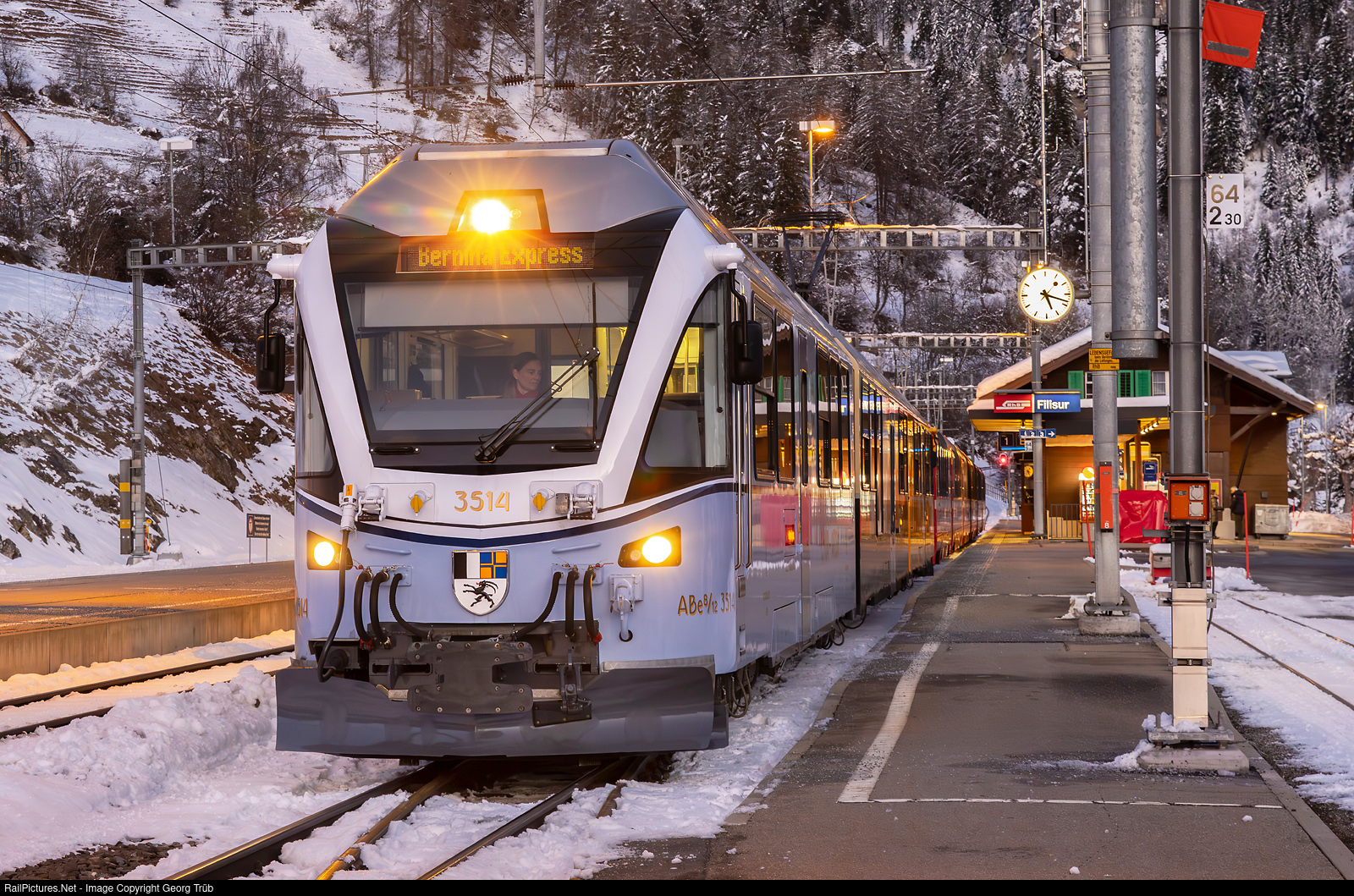 | When night is falling, the ancestor train (Ahnenzug) "Allegra" ABe 8/12 # 3514 of the Rhaetian Railway in heritage livery stopped at Filisur with the PE 952 BERNINA EXPRESS from Tirano over the UNESCO world heritage Bernina and Albula lines to Chur. |