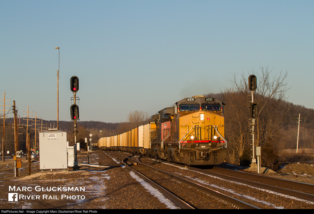 Name That Town After Your Railroad. As the double headed Union Pacific 6531 (AC44CW, 2/2000) and 6202 (née-Southern Pacific 130, AC44CW, 4/1995) approaches Dozier Crossing in Pacific, Missouri on January 13, 2012 with an empty coal train, the trace of snow remaining snow conveys the feel of the bone chilling cold temps. The former "espee" trailer is notable in its patched red paint, a contrast to the endless stream of armour yellow locomotives. The City of Pacific was named for the Pacific Railroad in 1849, a predecessor to the Missouri Pacific that would ultimately become part of Union Pacific in 1997.