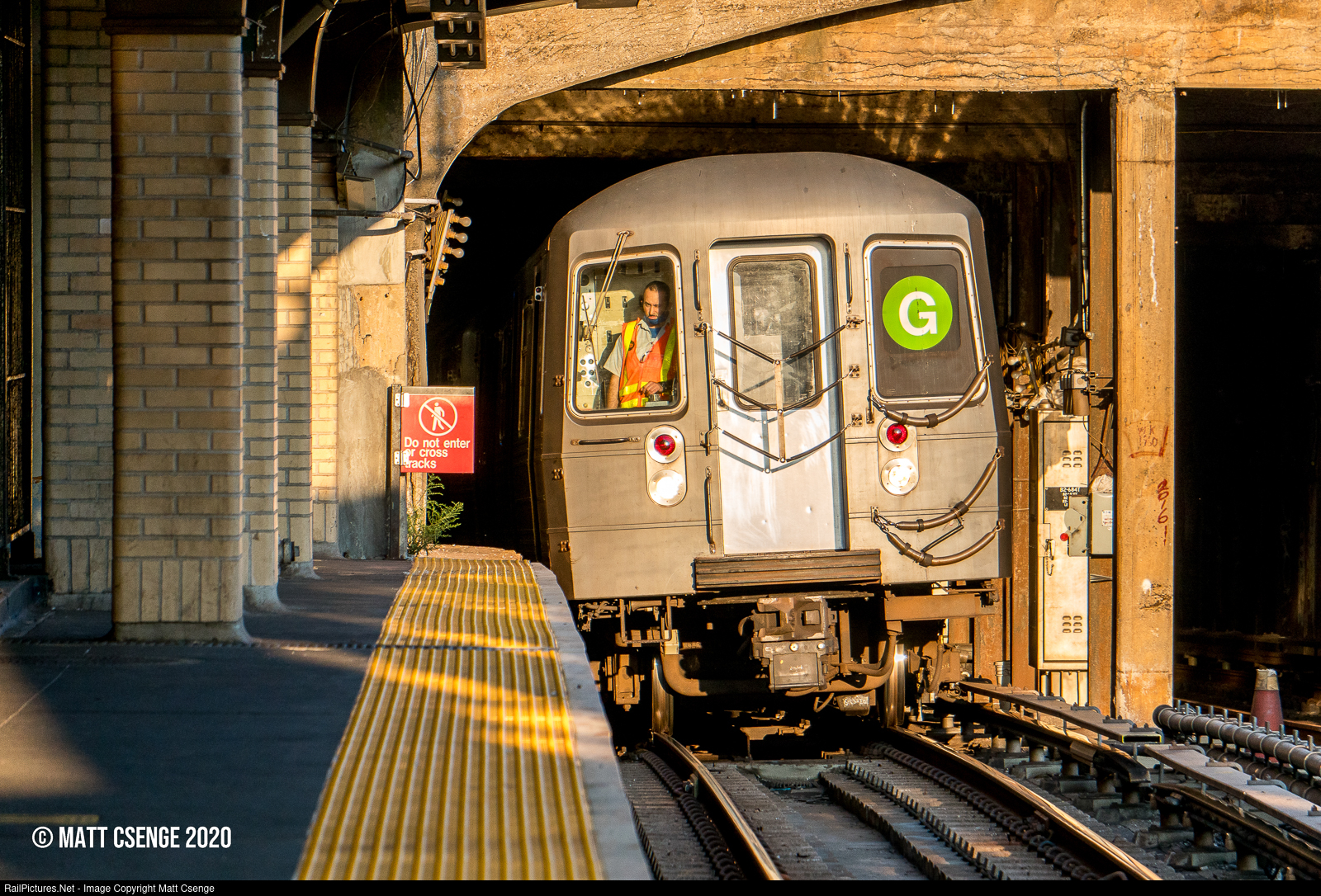 A Queens-bound (G) train emerges from the portal at 4th Av-9th St into the golden light of sunset.