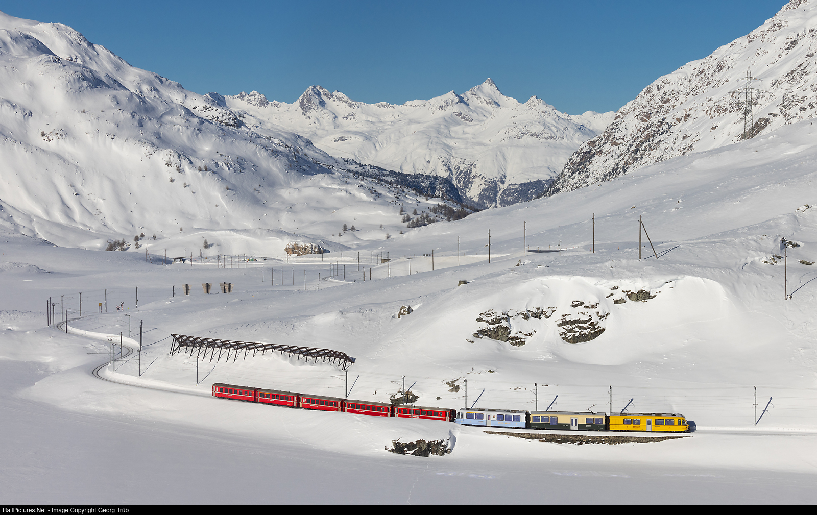 | "Allegra" ABe 8/12 # 3514 of the Rhaetian Railway got an ancestor (Ahnenzug) heritage livery, to commemorate the unification of the Bernina Railway and the Chur-Arosa Railway with the Rhaetian Railway during the Second World War. Pulling the train 1625 of the line RE9 from St.Moritz to Tirano, the # 3514 reaches the shore of the frozen and snow covered Lago Bianco (White Lake) on about 2250 meter a.s.l. between Bernina Lagalb and Ospizio Bernina. In the background Piz Saluver and Piz Ot north of the Engadine. |