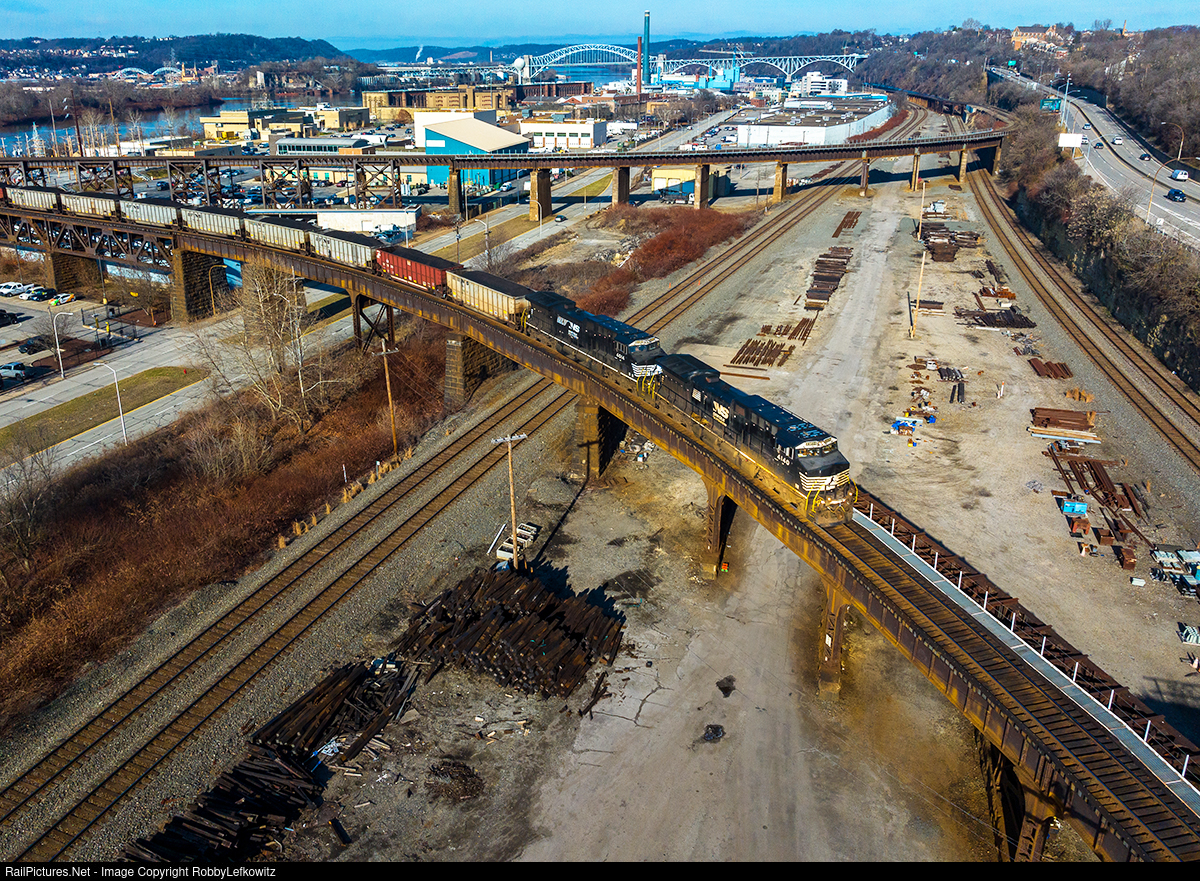 NS 4140 leads a doubled up NS 596 coal train off of the OC Bridge in Pittsburgh, as it prepares to enter onto the Conemaugh line and head toward Altoona. |