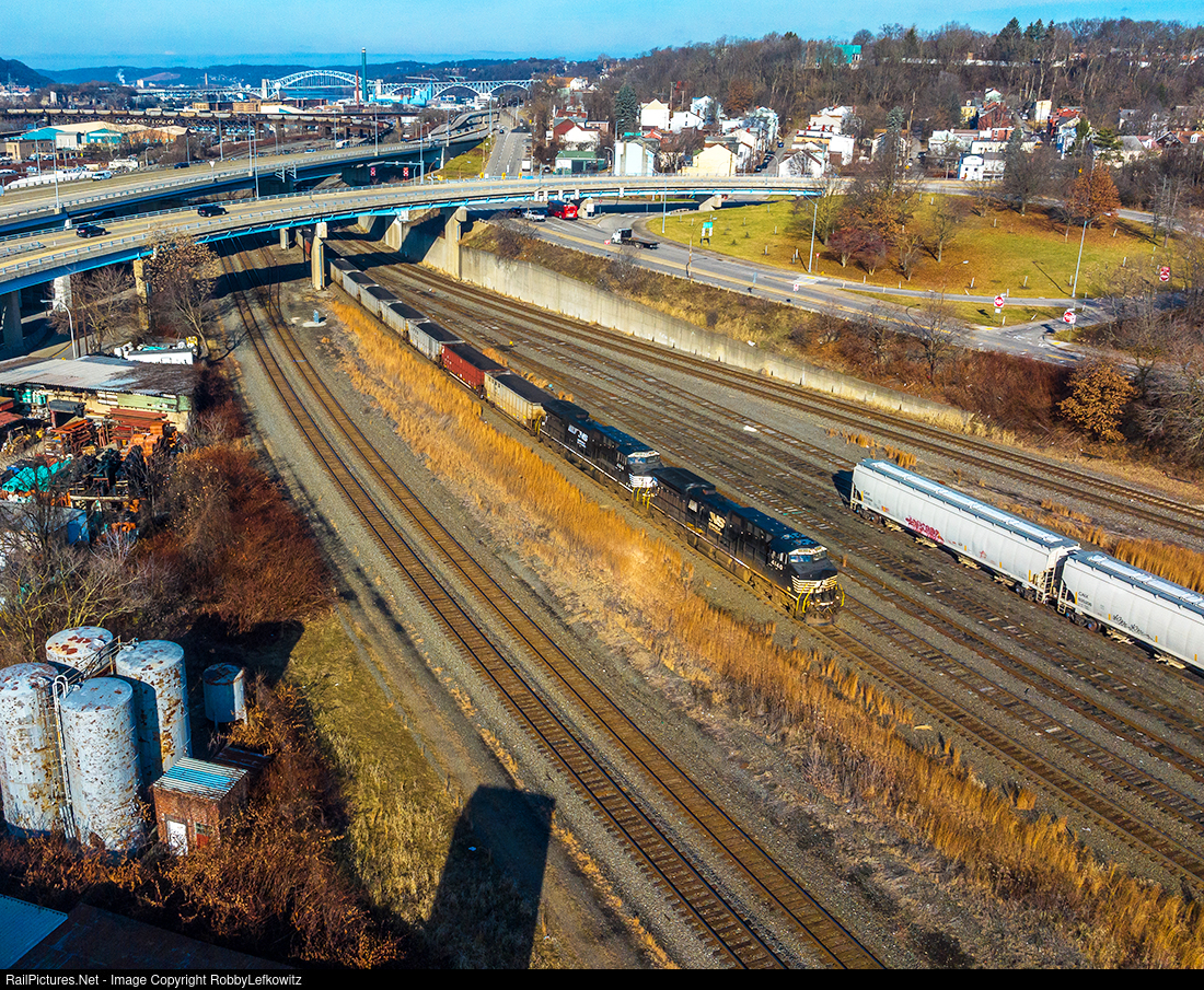 NS 4140 leads a doubled-up NS 596 coal train off of the OC Bridge in Pittsburgh as it prepares to enter onto the Conemaugh line and head toward Altoona. In this photo, the coal train can be seen wrapped around the bridge in the distance. |