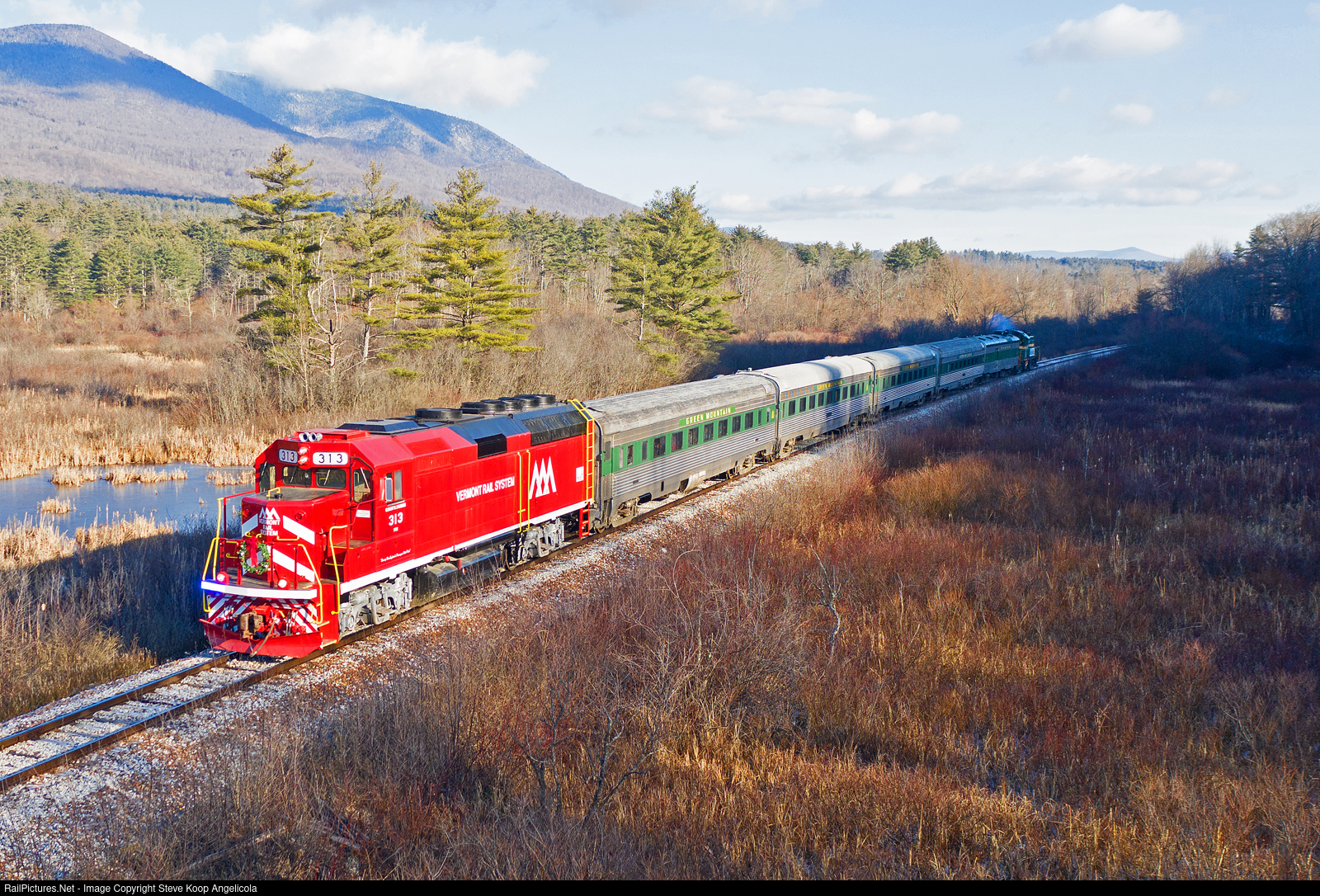 | Vermont Railway's Elf Express Christmas Train operated from Manchester to Arlington, VT with GP40FH-2 VTR 313 and RS-1 GMRC 405 providing an exceptional pair of locomotives for this years train. The 313 made its first mainline debut hauling passengers and the classic Alco 405 made an extremely rare appearance on the B&R line. |