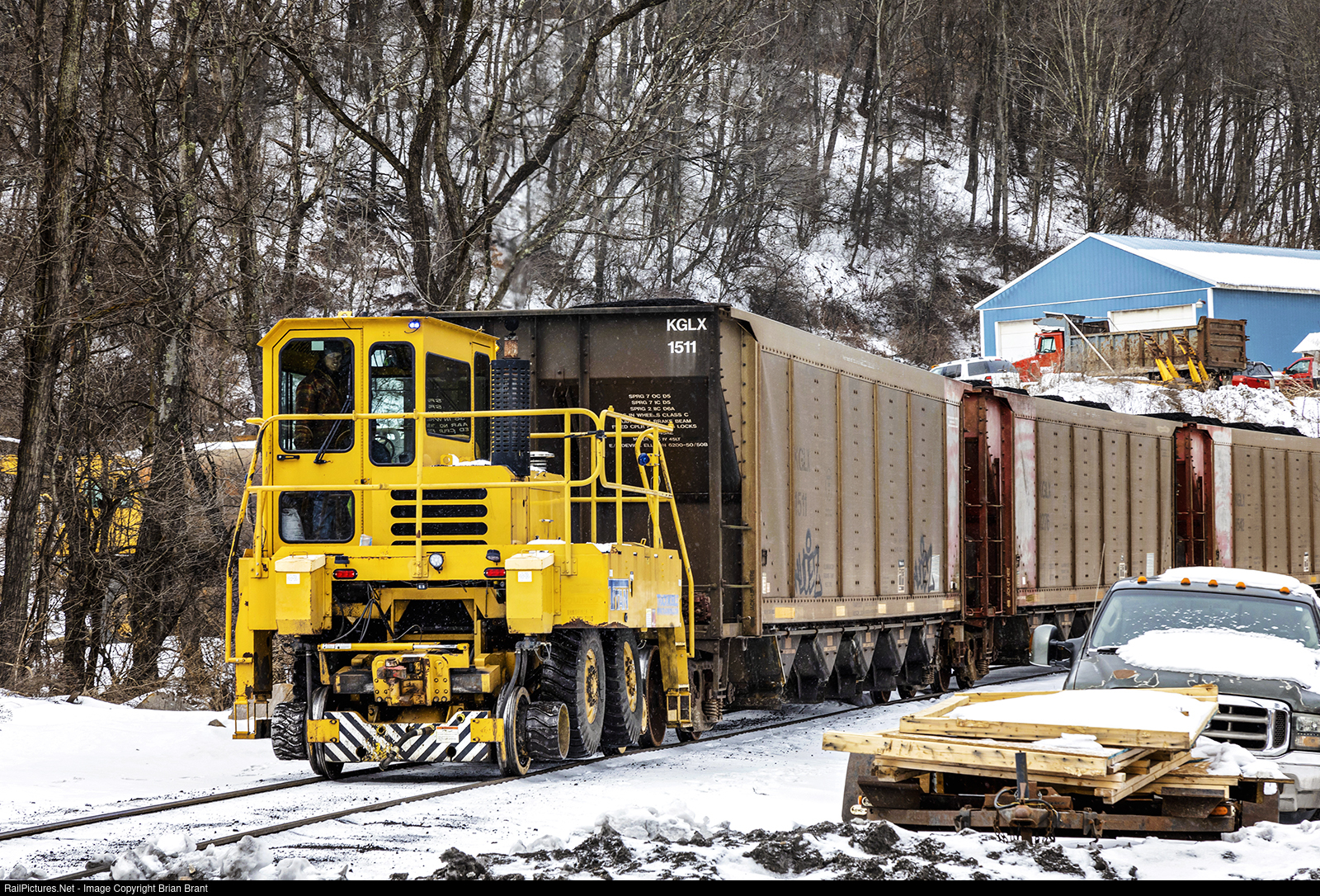 A TrackMobile is used to push loaded cars forward to prevent blocking a road crossing at the Shaw Mines coal loadout on the CSX Salisbury Sub. Shortly after this, the operator would go back for another cut of cars.