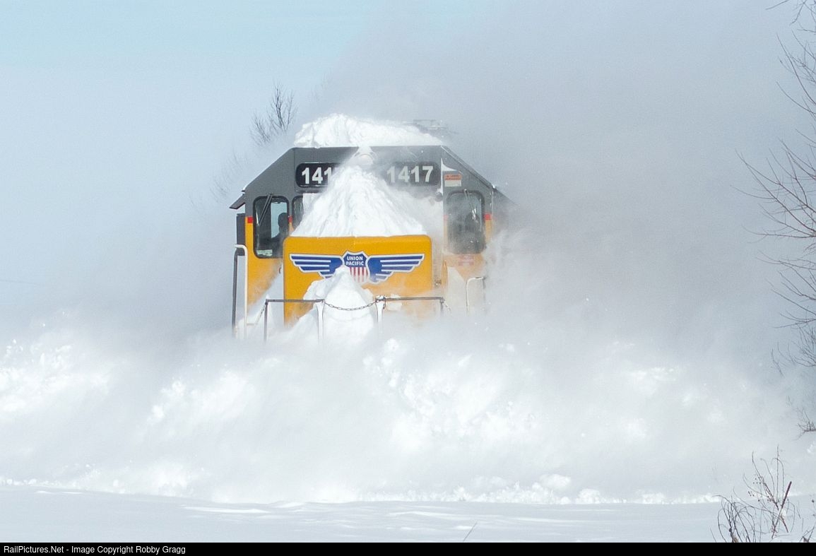| UP GP40-2 1417 leads the Troy Grove local South near Shabbona, IL, busting some nice drifts at Duffy Road. |