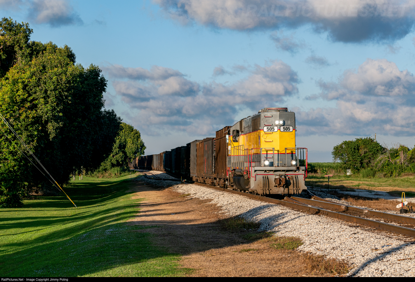 | An empty cane train with USSC GP40-2 505 heads east through the town of South Bay shortly after sunrise. The train is bound for a load out northeast of South Bay where they will pick up loads for the mill in Clewiston. |